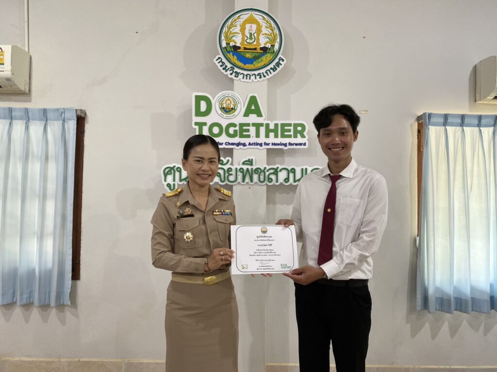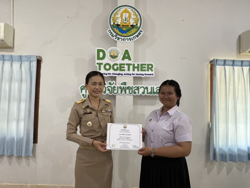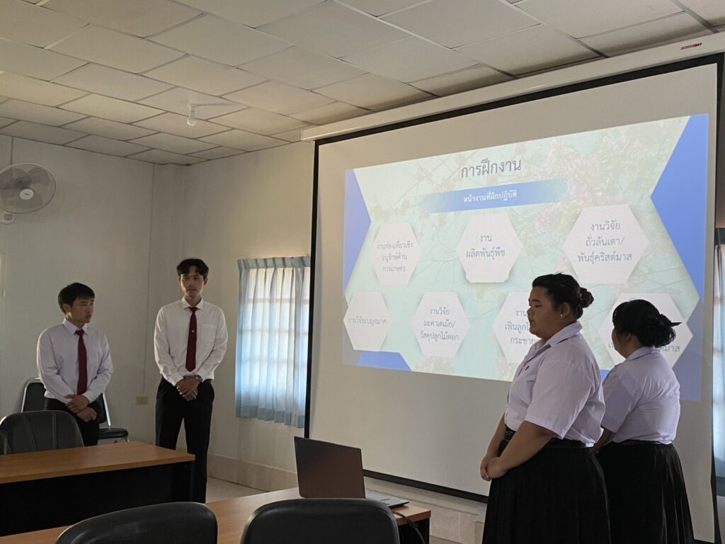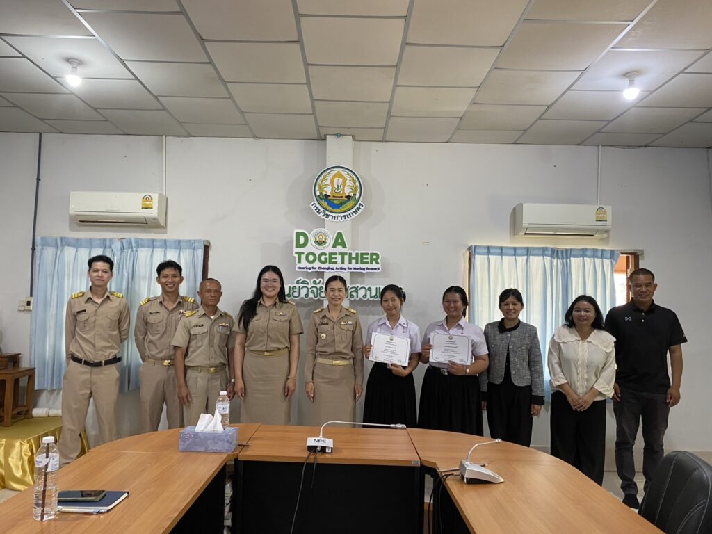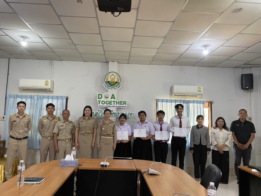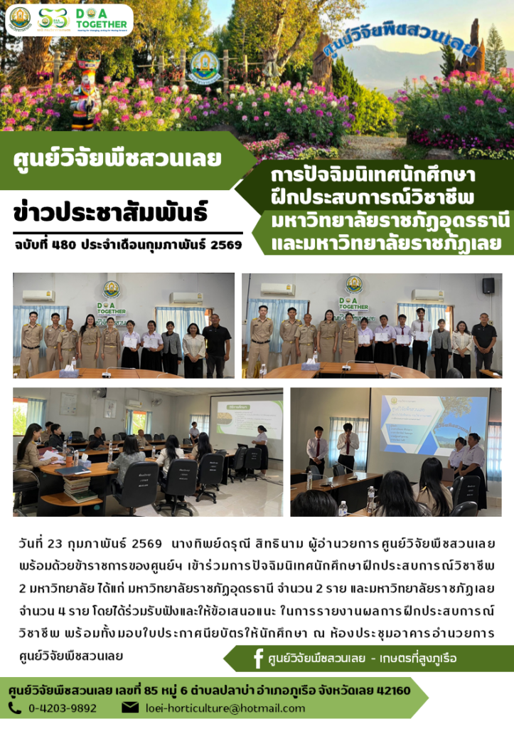 วันที่ 23 กุมภาพันธ์ 2569 นางทิพย์ดรุณี สิทธินาม ผู้อำนวยการศูนย์วิจัยพืชสวนเลย พร้อมด้วยข้าราชการของศูนย์ฯ เข้าร่วมการปัจฉิมนิเทศนักศึกษาฝึกประสบการณ์วิชาชีพ 2 มหาวิทยาลัย ได้แก่ มหาวิทยาลัยราชภัฏอุดรธานี จำนวน 2 ราย และมหาวิทยาลัยราชภัฏเลย จำนวน 4 ราย โดยได้ร่วมรับฟังและให้ข้อเสนอแนะ ในการรายงานผลการฝึกประสบการณ์วิชาชีพ พร้อมทั้งมอบใบประกาศนียบัตรให้นักศึกษา ณ ห้องประชุมอาคารอำนวยการ ศูนย์วิจัยพืชสวนเลย