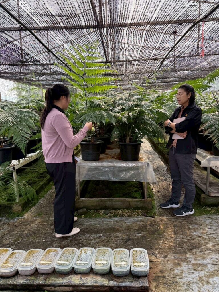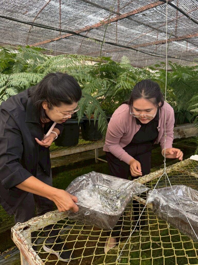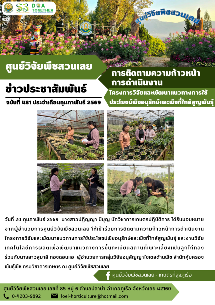 วันที่ 24 กุมภาพันธ์ 2569 นางสาวปฏิญญา มีบุญ นักวิชาการเกษตรปฏิบัติการ ได้รับมอบหมายจากผู้อำนวยการศูนย์วิจัยพืชสวนเลย ให้เข้าร่วมการติดตามความก้าวหน้าการดำเนินงานโครงการวิจัยและพัฒนาแนวทางการใช้ประโยชน์พืชอนุรักษ์และพืชที่ใกล้สูญพันธุ์ และงานวิจัยเทคโนโลยีการผลิตเพื่อพัฒนาแนวทางการขึ้นทะเบียนสถานที่เพาะเลี้ยงเฟินลูกไก่ทอง ร่วมกับนางสาวสุมาลี ทองดอนแอ ผู้อำนวยการกลุ่มวิจัยอนุสัญญาไซเตสด้านพืช สำนักคุ้มครองพันธุ์พืช กรมวิชาการเกษตร ณ ศูนย์วิจัยพืชสวนเลย