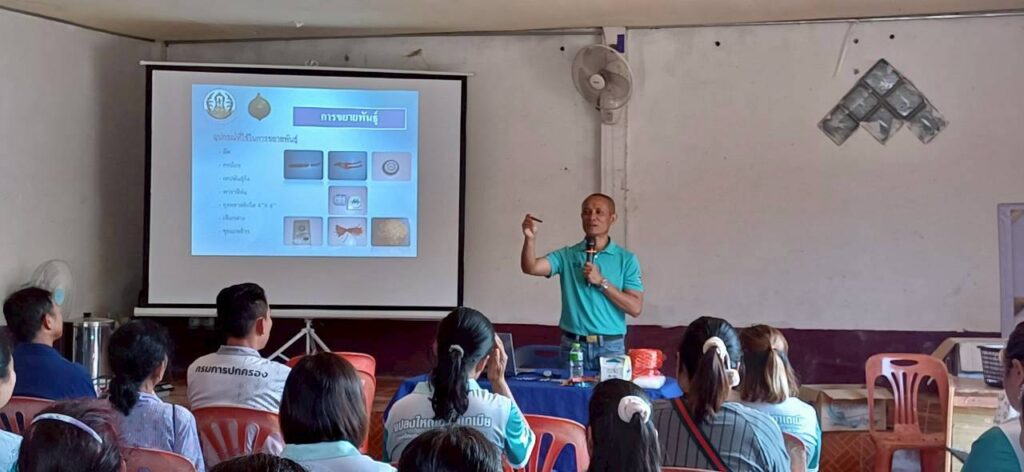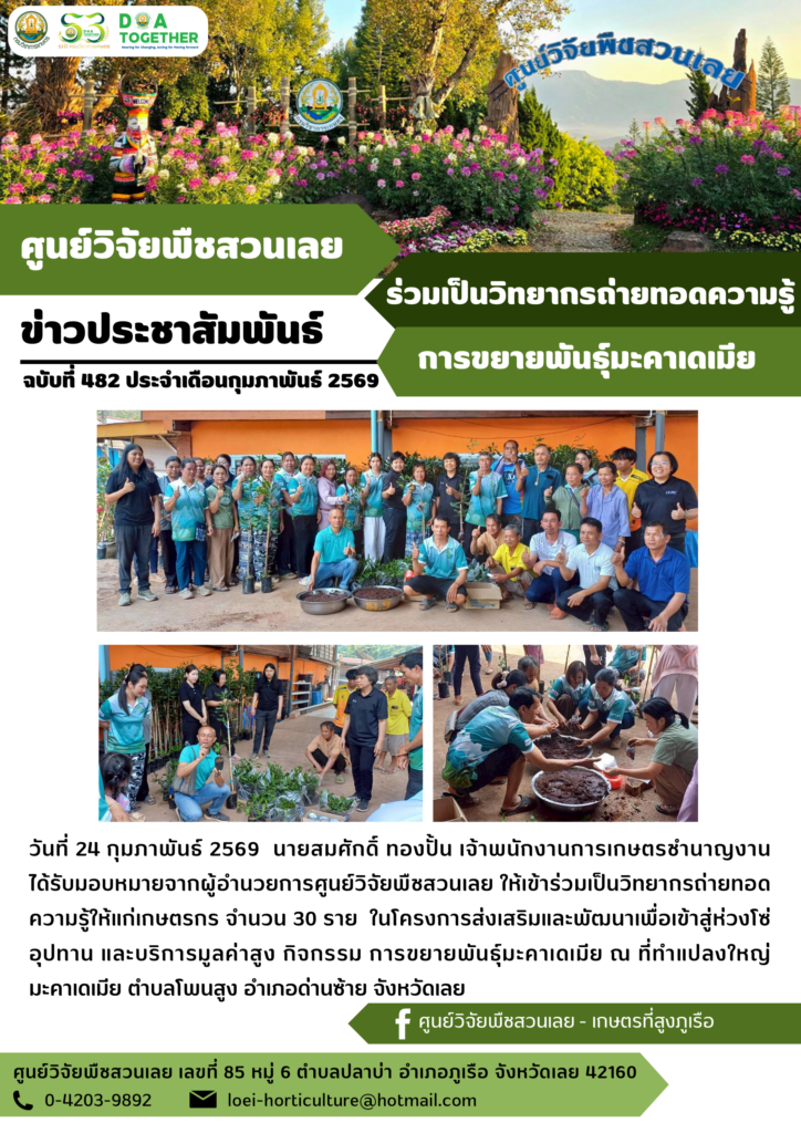 วันที่ 24 กุมภาพันธ์ 2569 นายสมศักดิ์ ทองปั้น เจ้าพนักงานการเกษตรชำนาญงาน ได้รับมอบหมายจากผู้อำนวยการศูนย์วิจัยพืชสวนเลย ให้เข้าร่วมเป็นวิทยากรถ่ายทอดความรู้ให้แก่เกษตรกร จำนวน 30 ราย ในโครงการส่งเสริมและพัฒนาเพื่อเข้าสู่ห่วงโซ่อุปทาน และบริการมูลค่าสูง กิจกรรม การขยายพันธุ์มะคาเดเมีย ณ ที่ทำแปลงใหญ่มะคาเดเมีย ตำบลโพนสูง อำเภอด่านซ้าย จังหวัดเลย