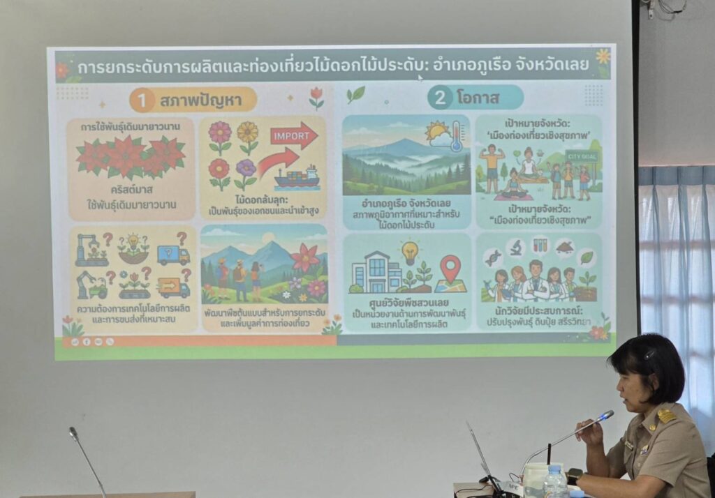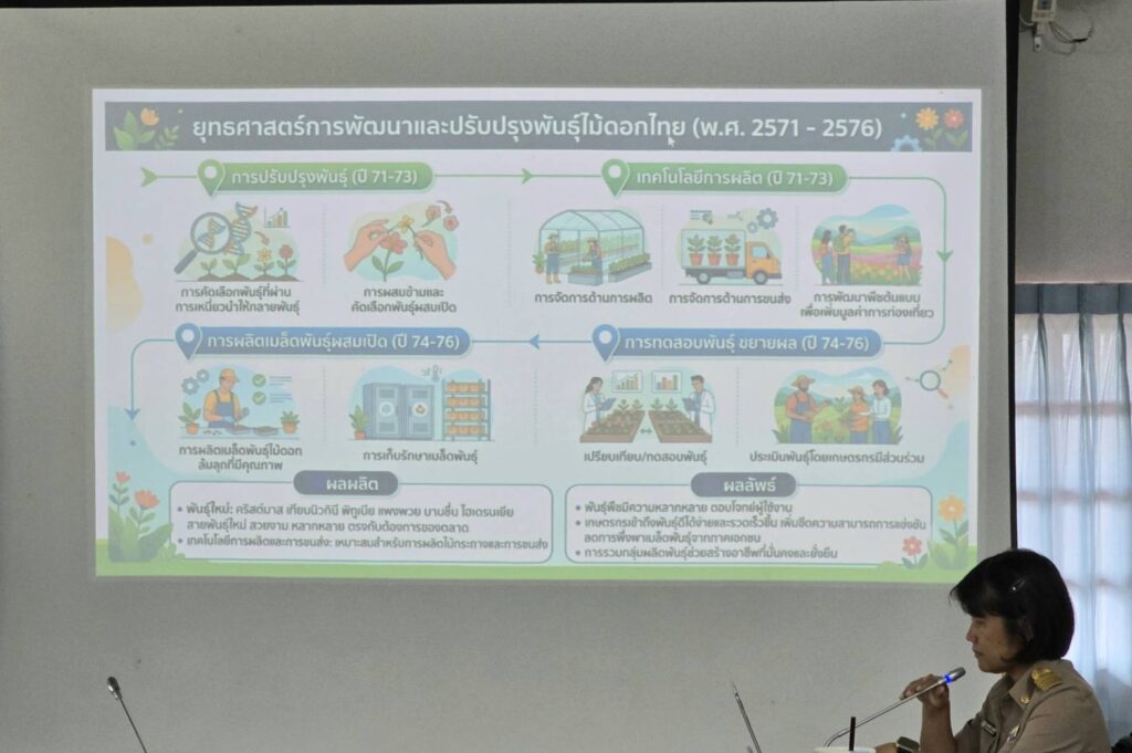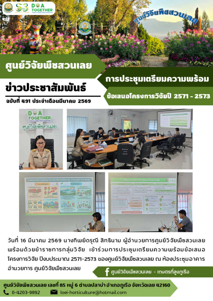 วันที่ 16 มีนาคม 2569 นางทิพย์ดรุณี สิทธินาม ผู้อำนวยการศูนย์วิจัยพืชสวนเลย พร้อมด้วยข้าราชการกลุ่มวิจัย เข้าร่วมการประชุมเตรียมความพร้อมข้อเสนอโครงการวิจัย ปีงบประมาณ 2571–2573 ของศูนย์วิจัยพืชสวนเลย ณ ห้องประชุมอาคารอำนวยการ ศูนย์วิจัยพืชสวนเลย