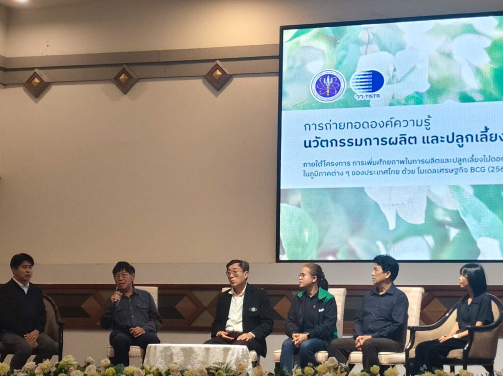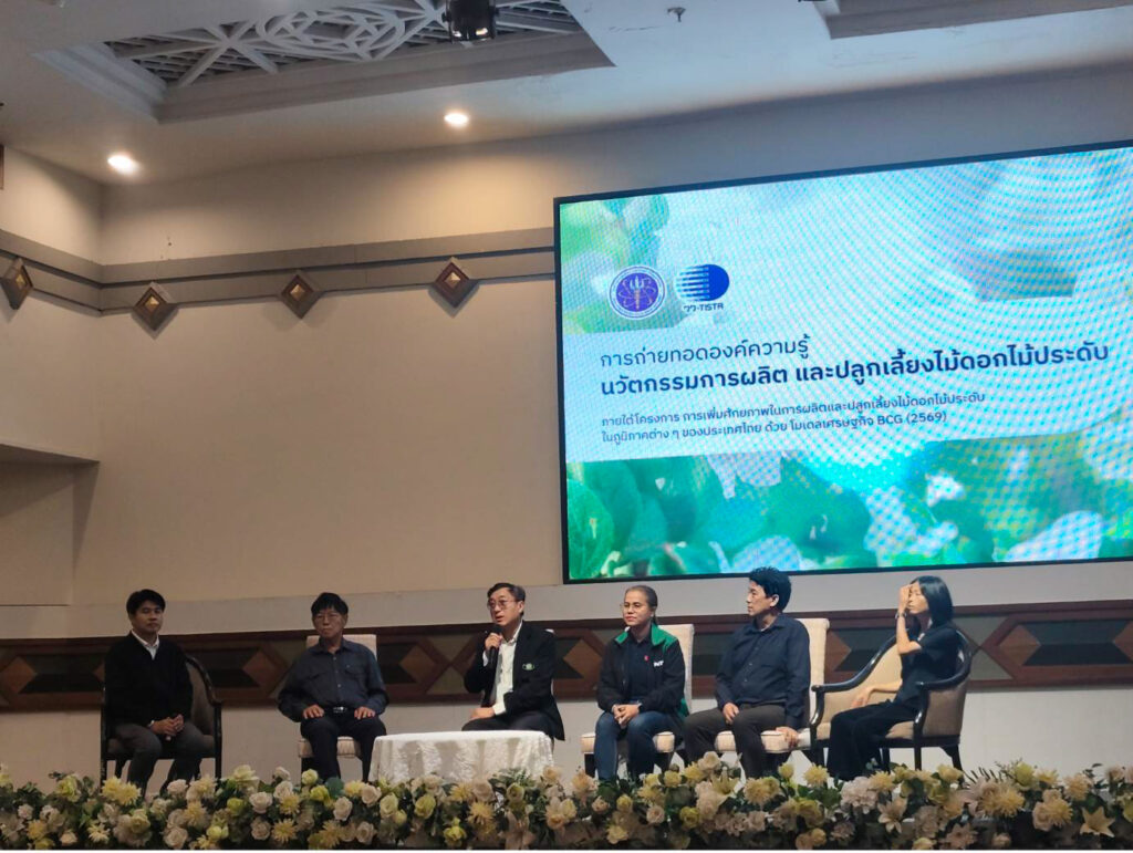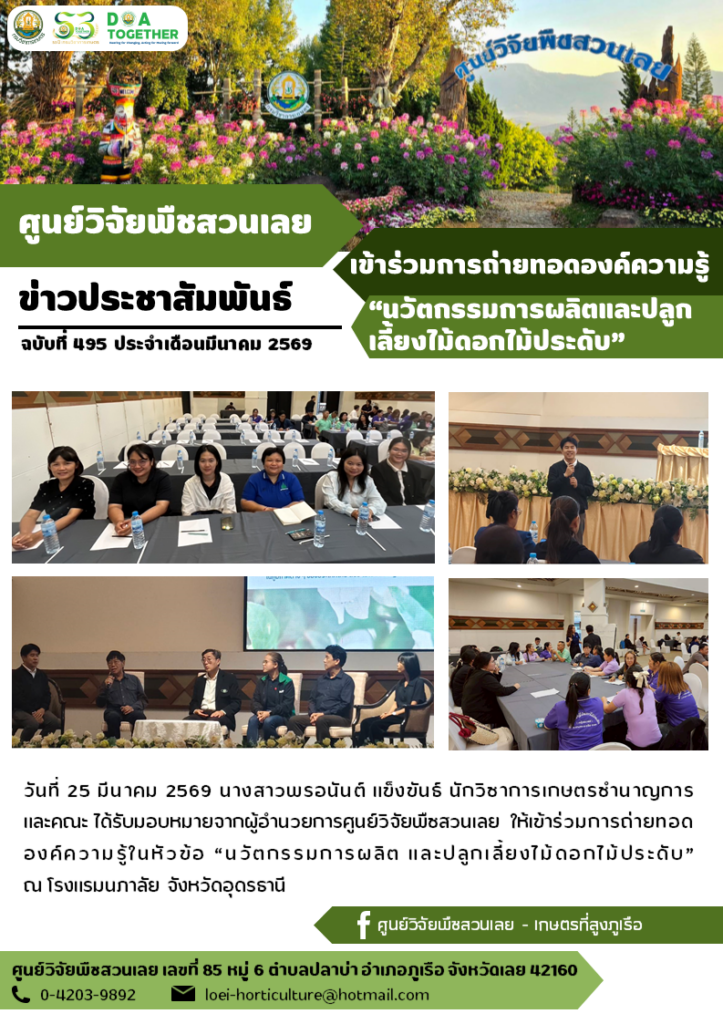 วันที่ 25 มีนาคม 2569 นางสาวพรอนันต์ แข็งขันธ์ นักวิชาการเกษตรชำนาญการ และคณะ ได้รับมอบหมายจากผู้อำนวยการศูนย์วิจัยพืชสวนเลย ให้เข้าร่วมการถ่ายทอดองค์ความรู้ในหัวข้อ “นวัตกรรมการผลิต และปลูกเลี้ยงไม้ดอกไม้ประดับ” ณ โรงแรมนภาลัย จังหวัดอุดรธานี