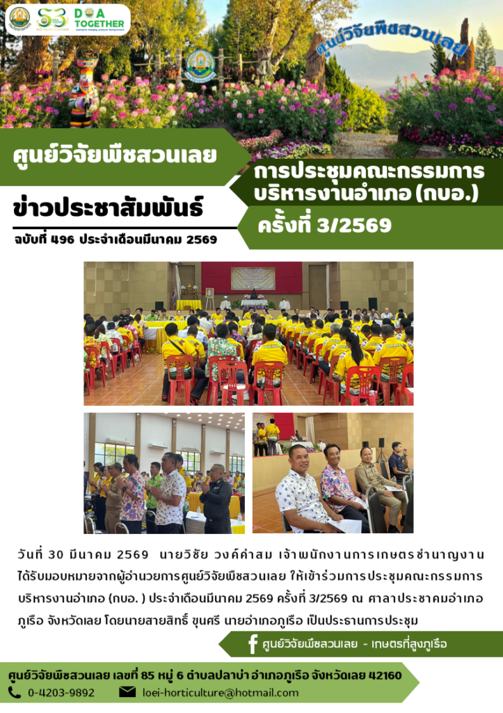 วันที่ 30 มีนาคม 2569 นายวิชัย วงค์คำสม เจ้าพนักงานการเกษตรชำนาญงาน ได้รับมอบหมายจากผู้อำนวยการศูนย์วิจัยพืชสวนเลย ให้เข้าร่วมการประชุมคณะกรรมการบริหารงานอำเภอ (กบอ. ) ประจำเดือนมีนาคม 2569 ครั้งที่ 3/2569 ณ ศาลาประชาคมอำเภอภูเรือ จังหวัดเลย โดยนายสายสิทธิ์ ขุนศรี นายอำเภอภูเรือ เป็นประธานการประชุม