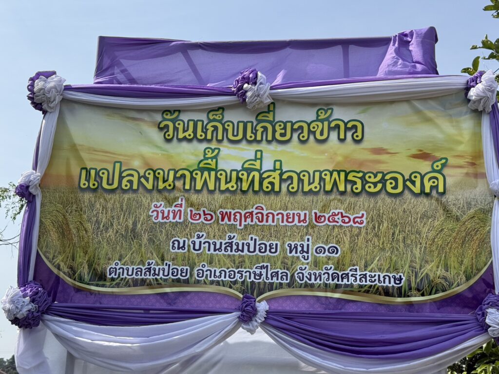 วันที่ 26 พฤศจิกายน 2568 เวลา 14.00 น. นางจีรภา ออสติน ผู้อำนวยการศูนย์วิจัยพืชสวนศรีสะเกษ พร้อมด้วยเจ้าหน้าที่ ร่วมกิจกรรมการเก็บเกี่ยวผลผลิตข้าว โครงการปลูกข้าวในพื้นที่ส่วนพระองค์ สมเด็จพระกนิษฐาธิราชเจ้า กรมสมเด็จพระเทพรัตนราชสุดาฯ สยามบรมราชกุมารี โดยมี นายอนุรัตน์ ธรรมประจำจิต ผู้ว่าราชการจังหวัดศรีสะเกษ เป็นประธานในพิธี ณ ที่ตั้งแปลงนาส่วนพระองค์ฯ หมู่ที่ 11 ตำบลส้มป่อย อำเภอราศีไศล จังหวัดศรีสะเกษ