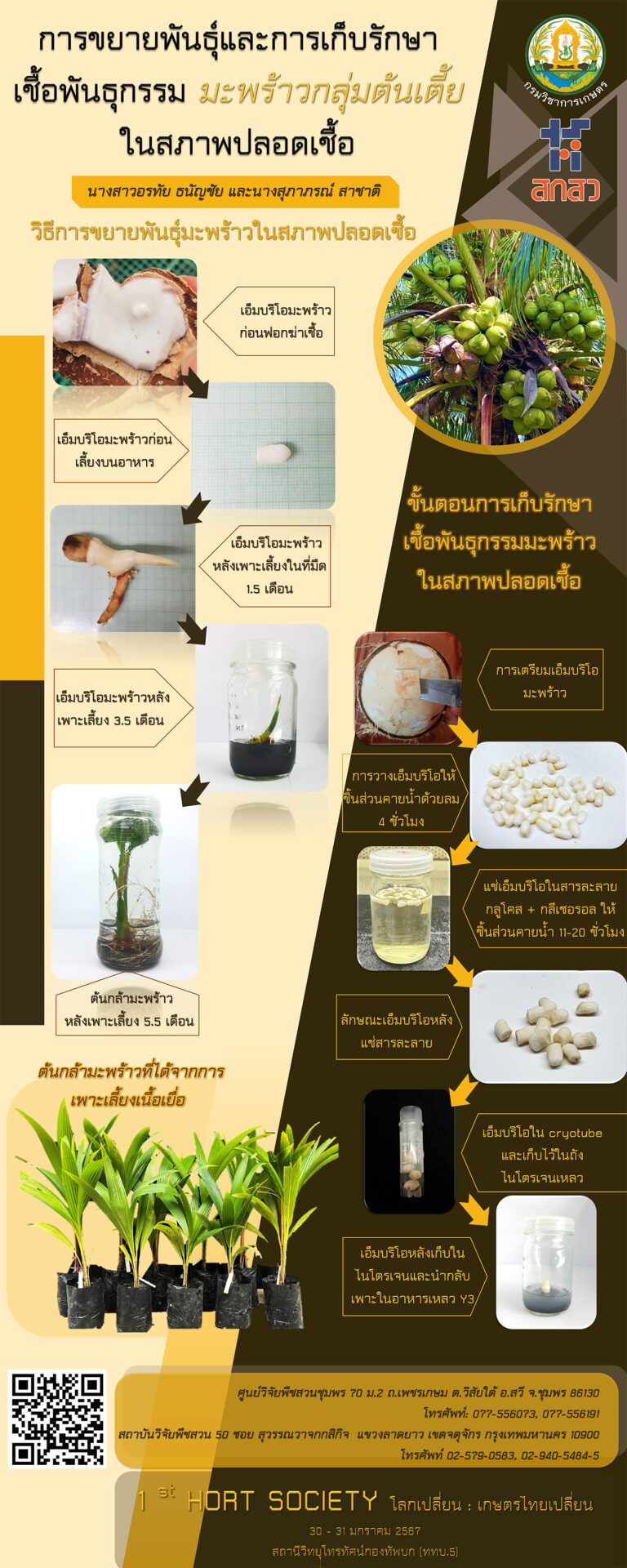 โปสเตอร์ การขยายพันธุ์และการเก็บรักษาเชื้อพันธุกรรม มะพร้าวกลุ่มต้นเตี้ย ในสภาพปลอดเชื้อ28 กุมภาพันธ์ 25674 มีนาคม 2024
