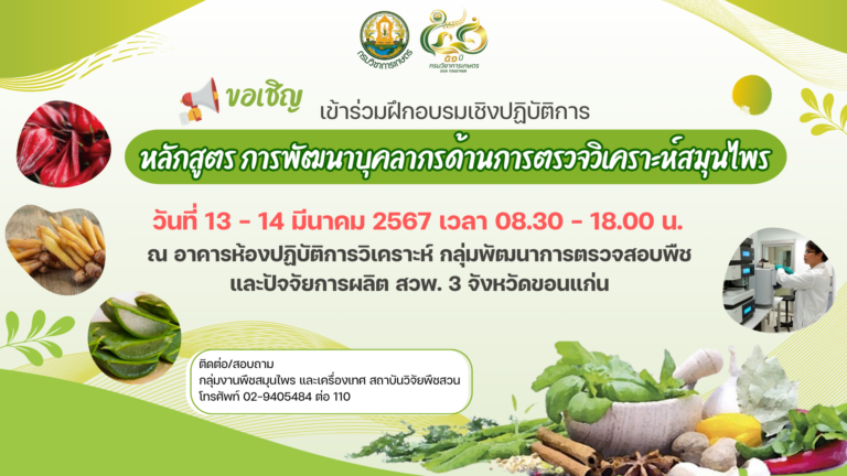 ข่าวประชาสัมพันธ์ ขอเชิญ!! เข้าร่วมฝึกอบรมเชิงปฏิบัติการ หลักสูตร การพัฒนาบุคลากรด้านการตรวจวิเคราะห์สมุนไพร14 กุมภาพันธ์ 256714 กุมภาพันธ์ 2024