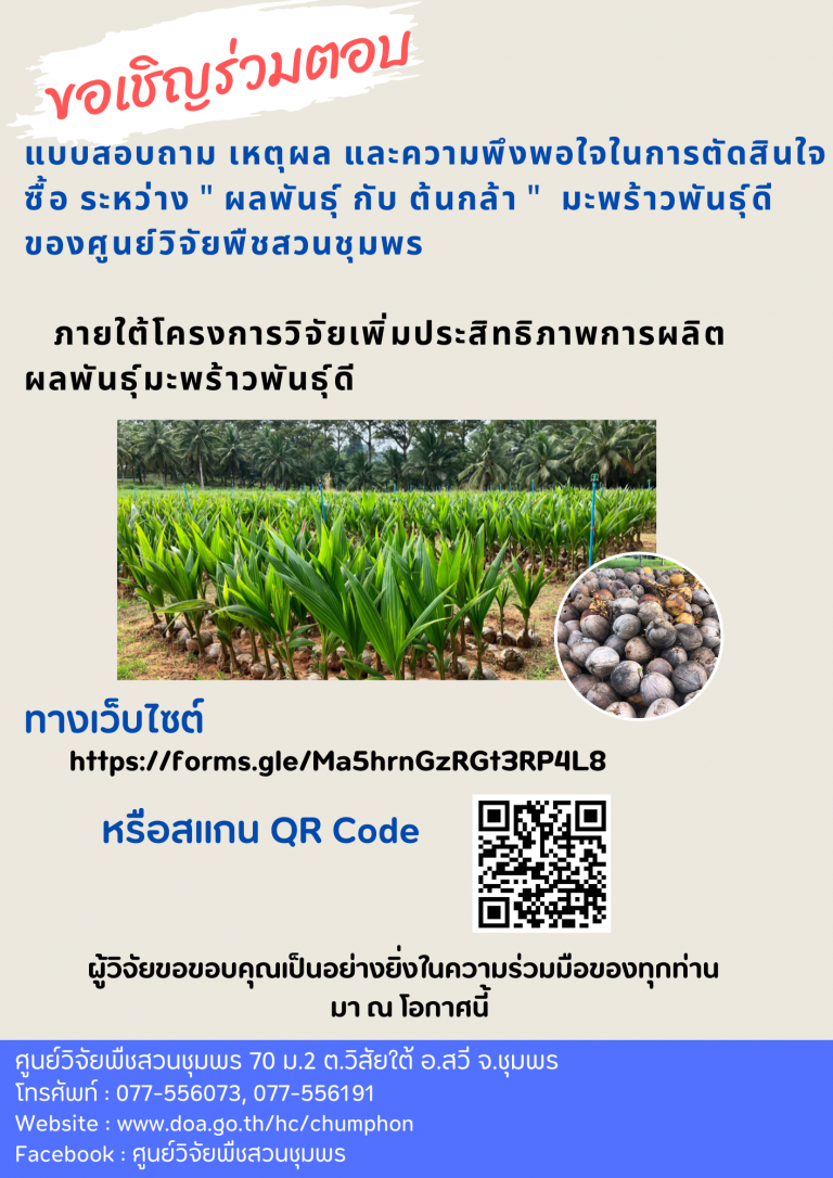 ข่าวประชาสัมพันธ์ แบบสอบถาม เหตุผล และความพึงพอใจในการตัดสินใจซื้อ ระหว่าง ” ผลพันธุ์ กับ ต้นกล้า ” มะพร้าวพันธุ์ดีของศูนย์วิจัยพืชสวนชุมพร ภายใต้โครงการวิจัยเพิ่มประสิทธิภาพการผลิตผลพันธุ์มะพร้าวพันธุ์ดี6 กุมภาพันธ์ 25676 กุมภาพันธ์ 2024