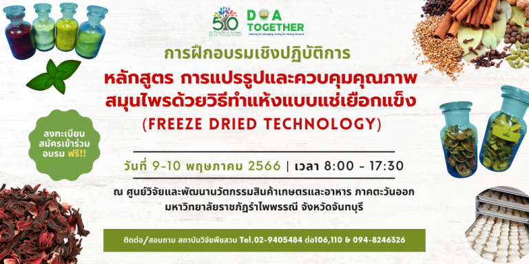 ข่าวประชาสัมพันธ์ ขอเชิญเข้าร่วม!! การฝึกอบรมเชิงปฏิบัติการ หลักสูตร การแปรรูปและควบคุมคุณภาพสมุนไพรด้วยวิธีทำแห้งแบบแช่เยือกแข็ง (Freeze dried Technology)10 เมษายน 256610 เมษายน 2023