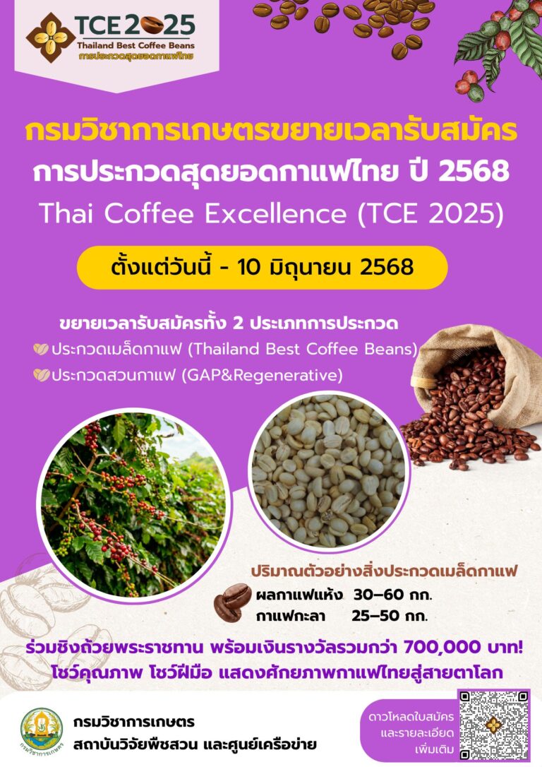 ประกาศกรมวิชาการเกษตร เรื่อง ขยายเวลารับใบสมัครและสิ่งประกวด และปรับปริมาณตัวอย่างสิ่งประกวดเมล็ดกาแฟ (Thailand Best Coffee Beans 2025) การประกวดสุดยอดกาแฟไทย ปี 25686 มิถุนายน 25686 มิถุนายน 2025