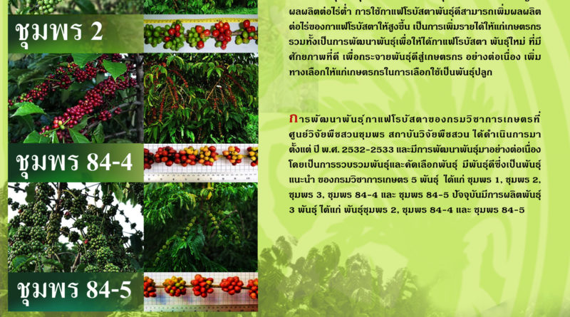 4.การผลิตและเพิ่มผลผลิตกาแฟโรบัสต้า ซึ่งนำเสนอผลงานของ ศูนย์วิจัยพืชสวนชุมพร ในด้านการตัดฟื้นต้น และเสียบยอด ซึ่งผลผลิตกาแฟทีออกใหม่ จะได้ผลผลิตมากกว่าเดิม ปัจจุบัน มีการขยายผลถ่ายทอดในพื้นที่ จ.ระนอง และ จ.ชุมพร