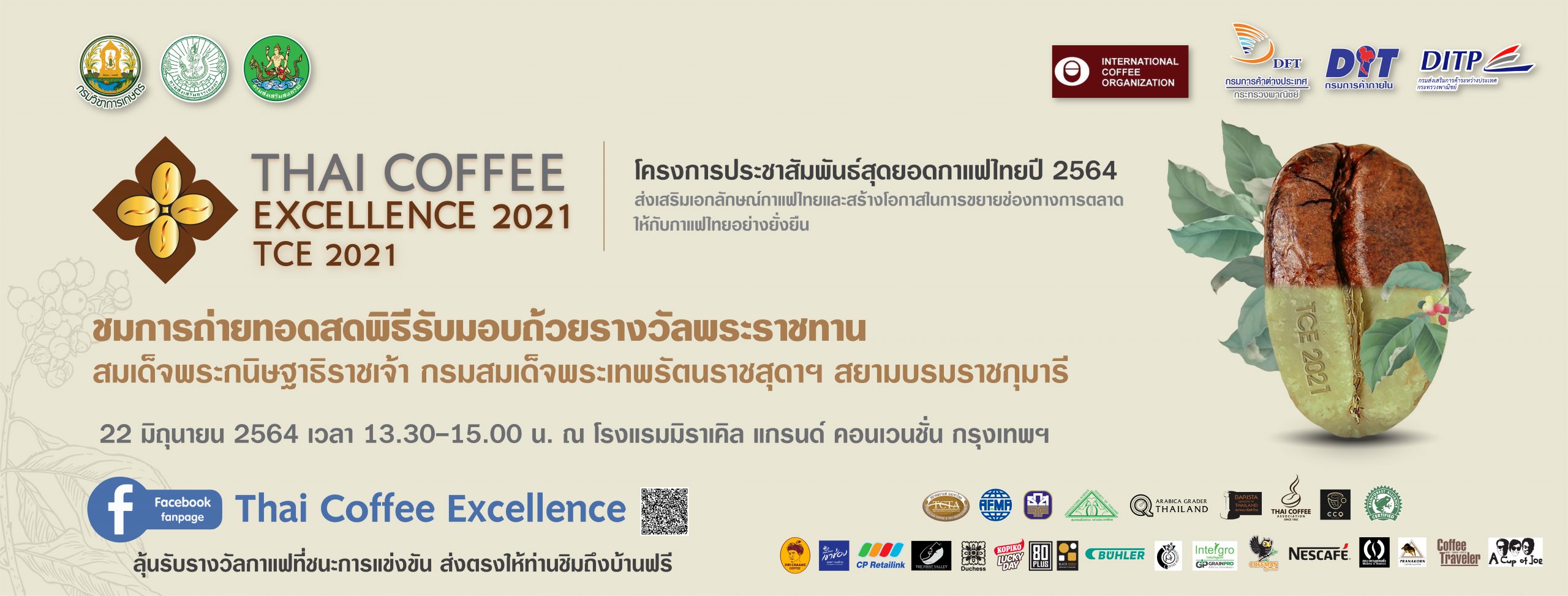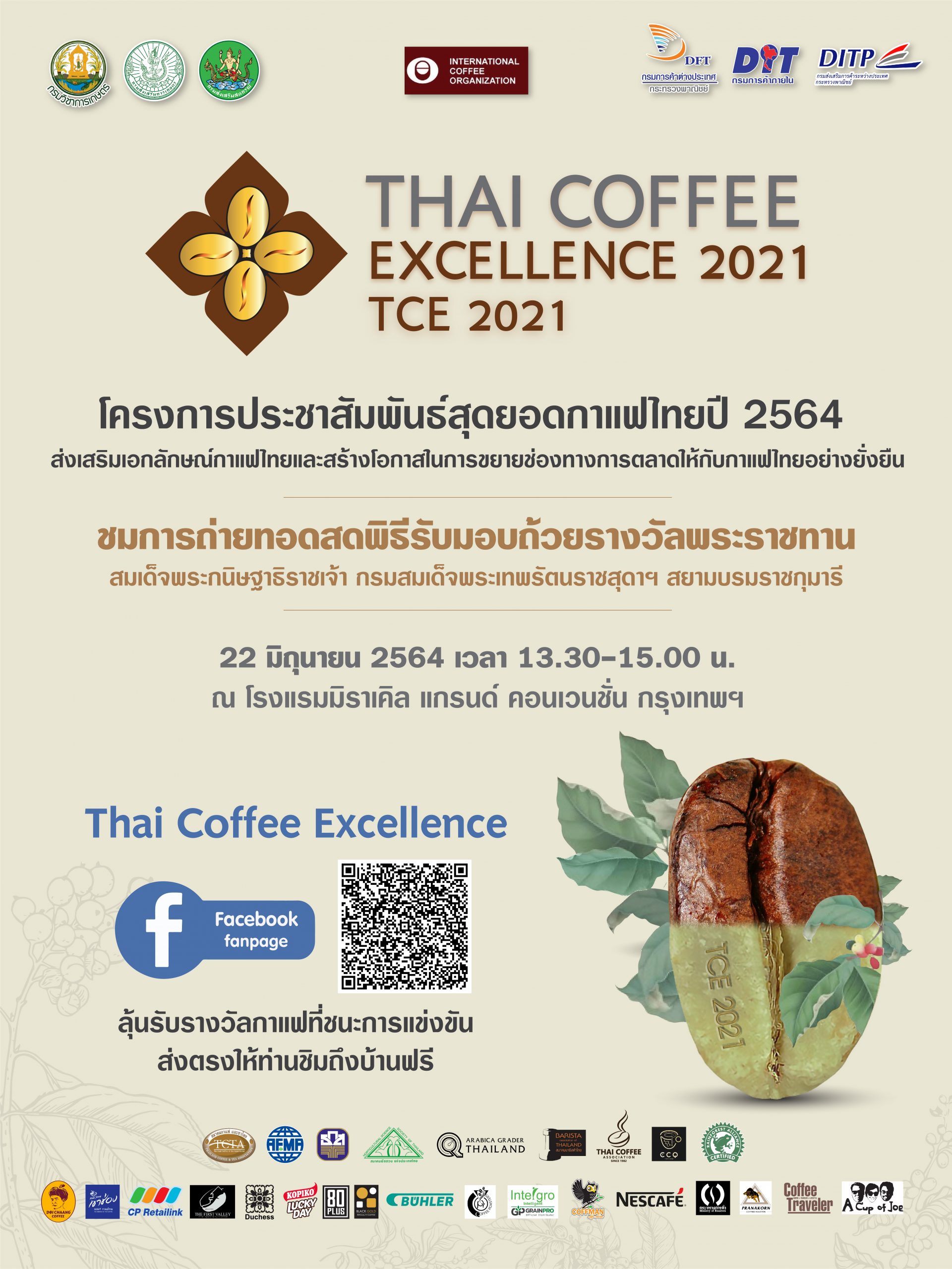 22 มิถุนายนนี้ เวลา 13.30-15.00 น. ถ่ายทอดสดตรงจาก โรงแรมมิราเคิล แกรนด์ กรุงเทพฯ ในโครงการประชาสัมพันธ์สุดยอดกาแฟไทย ปี 2564 จัดโดย กระทรวงเกษตรและสหกรณ์ โดย กรมวิชาการเกษตร กรมส่งเสริมการเกษตร กรมส่งเสริมสหกรณ์ ร่วมกับ กระทรวงพาณิชย์ โดย กรมการค้าต่างประเทศ กรมการค้าภายใน กรมส่งเสริมการค้าระหว่างประเทศ และธนาคารเพื่อการเกษตรและสหกรณ์การเกษตร พร้อมด้วยภาคเอกชนและเกษตรกร โดยได้รับการสนับสนุนจากองค์การกาแฟระหว่างประเทศ หรือ ICO ร่วมกันจัดกิจกรรมประชาสัมพันธ์ เพื่อกระตุ้นตลาดกาแฟ สร้างการรับรู้สุดยอดกาแฟไทย ที่มีความโดดเด่นและมีเอกลักษณ์ของรสชาติ ให้เป็นที่รู้จักในวงที่กว้างขึ้น โดยเฉพาะในกลุ่มผู้บริโภคกาแฟรุ่นใหม่