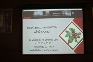 วันที่ 10 พฤศจิกายน 2565 นายสุรกิตติ ศรีกุล ผู้ทรงคุณวุฒิด้านการผลิตพืช เป็นประธาน ประชุมคณะทำงานพืชกาแฟ ครั้ง ที่ 6/2565 ผ่านระบบออนไลน์ ณ ห้องประชุม ชั้น 3 ห้อง 321 สถาบันวิจัยพืชสวน