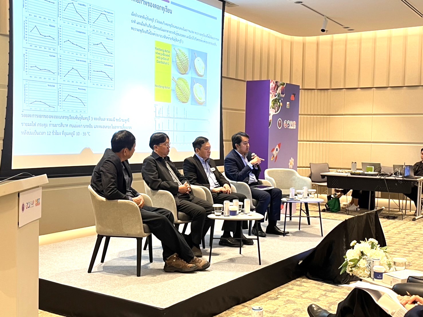 ในการนี้ ดร.ธีรวุฒิ ชุตินันทกุล ได้เข้าร่วมการเสวนา เรื่อง “การส่งออกทุเรียนไทย : การปรับตัวของเกษตรกรไทยภายใต้สภาพอากาศที่เปลี่ยนแปลง” โดยได้นำเสนอผลงานวิจัยของกรมวิชาการเกษตรเกี่ยวกับการจัดการทุเรียนเพื่อรองรับการเปลี่ยนแปลงสภาพภูมิอากาศ ร่วมกับผู้ทรงคุณวุฒิ จากมหาวิทยาลัย หน่วยงานเอกชน และผู้นำเกษตรกร ซึ่งมีการแลกเปลี่ยนความเห็นกันอย่างกว้างขวางเพื่อพัฒนาศักยภาพการผลิตทุเรียนของไทย
