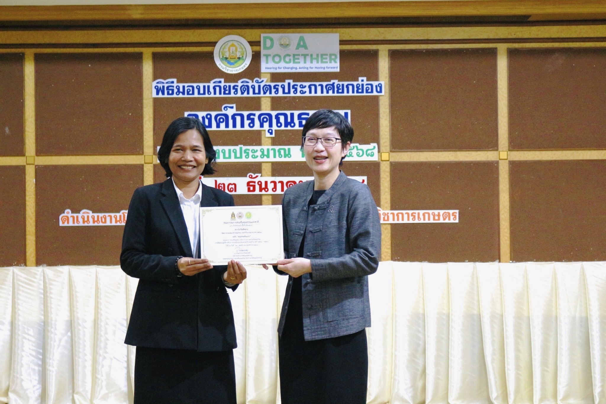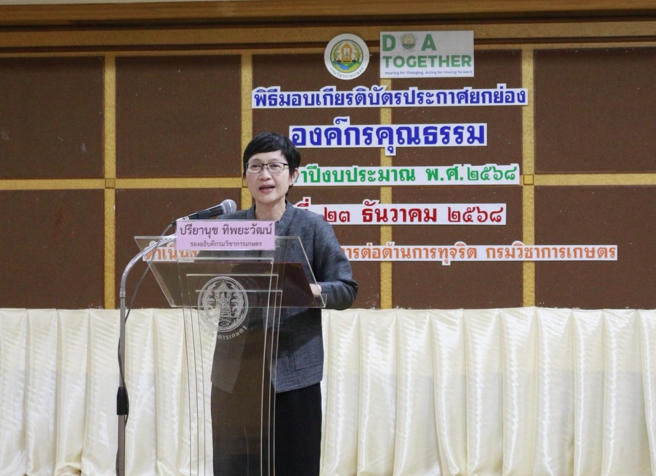 วันที่ 23 ธันวาคม 2568 นางสาวปรียานุช ทิพยะวัฒน์ รองอธิบดีกรมวิชาการ เป็นประธานพิธีมอบเกียรติบัตรประกาศยกย่ององค์กรคุณธรรม หน่วยงานในสังกัดกรมวิชาการเกษตร ประจำปีงบประมาณ พ.ศ. 2568 ณ ห้องประชุม 314 ตึกกสิกรรม กรมวิชาการเกษตร