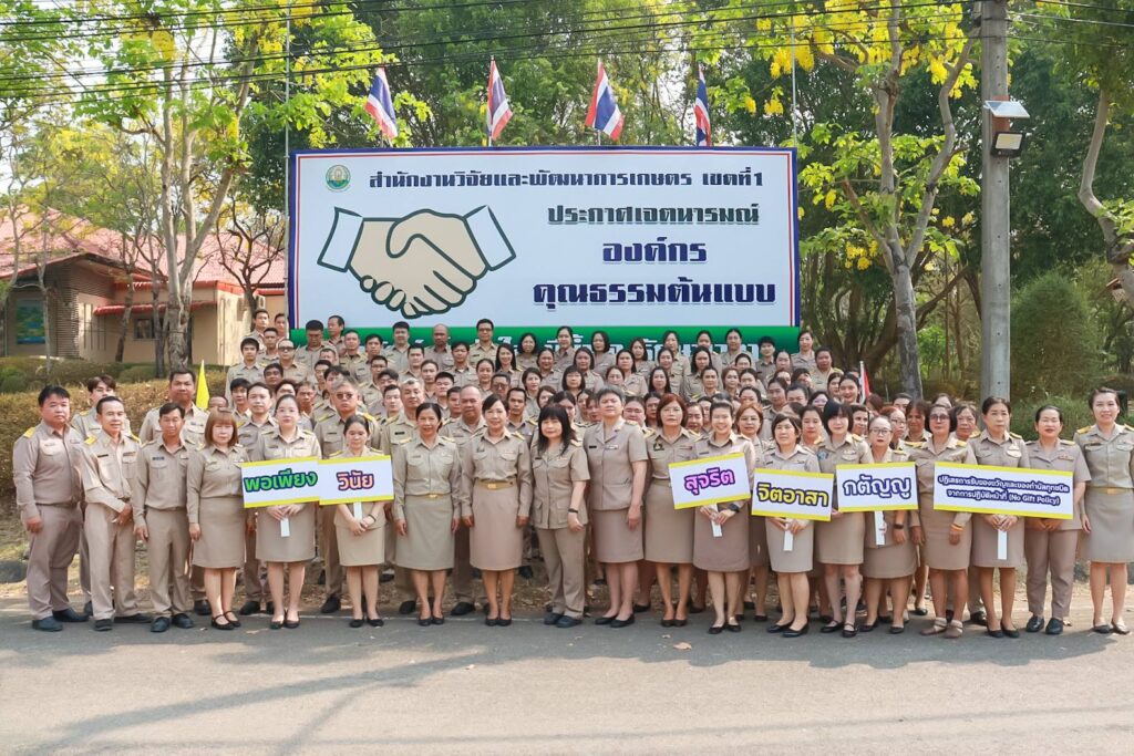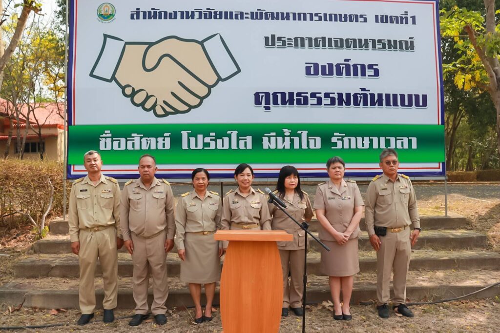 ข่าวประชาสัมพันธ์ สวพ.1 ประกาศเจตนารมณ์ องค์กรคุณธรรม “ซื่อสัตย์ โปร่งใส มีน้ำใจ รักษาเวลา” 04/21/2569 admin วันที่ 20 เมษายน 2569 นางสาวจงรัก อิ่มใจ ผู้อำนวยการสำนักงานวิจัยและพัฒนาการเกษตร เขตที่ 1 พร้อมด้วย ขรก. พรก. รวม 115 คน ร่วมประกาศเจตนารมณ์เป็นองค์กรคุณธรรม ประจำปีงบประมาณ พ.ศ. 2569 พร้อมแสดงออกเชิงสัญลักษณ์ โดยได้ร่วมประกาศเจตนารมณ์ 4 ประการ “ซื่อสัตย์ โปร่งใส มีน้ำใจ รักษาเวลา” เพื่อใช้เป็นหลักนำทางการดำเนินชีวิตและหลักคิดในการทำงาน การประกาศเจตนารมณ์ครั้งนี้ เน้นให้บุคลากรใช้หลักธรรมทางศาสนาเป็นพื้นฐานขับเคลื่อนการดำเนินงานร่วมกันภายในหน่วยงาน เพื่อมุ่งสู่การเป็นองค์กรคุณธรรมต้นแบบ FacebookFacebookXTwitterLINELine