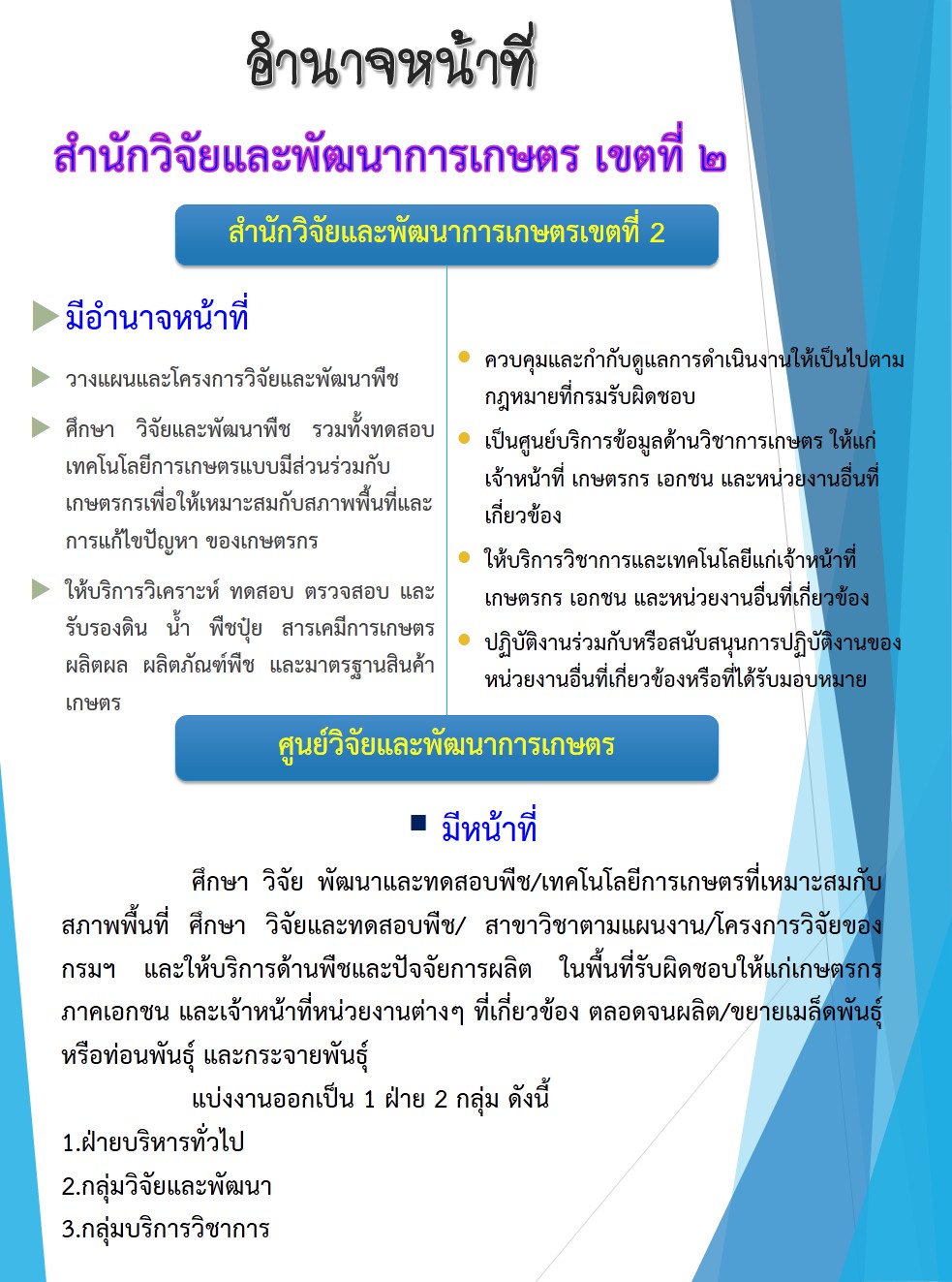 บทบาทและภารกิจภายในกลุ่มงาน สำนักวิจัยและพัฒนาการเกษตรเขตที่ 2