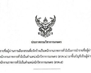 ประกาศกรมวิชาการเกษตร เรื่อง บัญชีรายชื่อผู้ผ่านการเลือกสรรเพื่อจัดจ้างเป็นพนักงานราชการทั่วไปในการนำรายชื่อผู้ผ่านการเลือกสรรเป็นพนักงานราชการทั่วไป ในตำแหน่งนักวิชาการเกษตร (สวพ.2) มาขึ้นบัญชีเป็นผู้ผ่านการเลือกสรรเป็นพนักงานราชการทั่วไป ในตำแหน่งนักวิชาการเกษตร (สวพ.5)