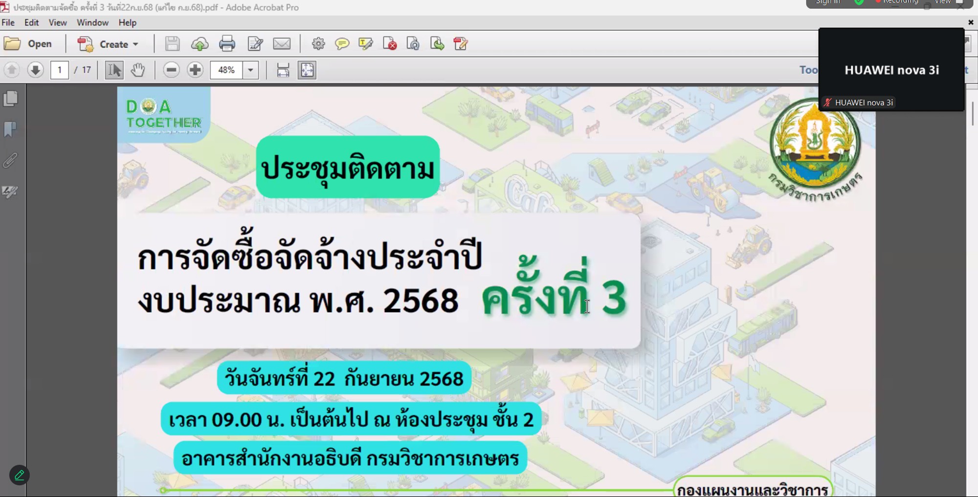 วันที่ 22 กันยายน 2568 ดร.อารดา มาสริ ผู้อำนวยการสำนักวิจัยและพัฒนาการเกษตรเขตที่ 5 พร้อมด้วยนางเพ็ญลักษณ์ ชูดี ผู้อำนวยการศูนย์วิจัยและพัฒนาการเกษตรนครปฐม นางสาวอาภรณ์ ทองบุราณ ผู้อำนวยการกลุ่มพัฒนาการตรวจสอบพืชและปัจจัยการผลิต นางโสรยา รื่นรวย ผู้อำนวยการกลุ่มประสานและบริหารนโยบาย และนางสาวเพ็ญแข แขกระจ่าง นักวิเคราะห์นโยบายและแผนชำนาญการ เข้าร่วมประชุมติดตามการจัดซื้อจัดจ้างประจำปีงบประมาณ พ.ศ.2568 ครั้งที่ 3 โดยมี นายรพีภัทร์ จันทรศรีวงศ์ อธิบดีกรมวิชาการเกษตร เป็นประธานในการประชุม ผ่านสื่ออิเล็กทรอนิกส์ระบบออนไลน์ Application Zoom ณ ห้องประชุมอาคารอำนวยการ สำนักวิจัยและพัฒนาการเกษตรเขตที่ 5 อำเภอสรรพยา จังหวัดชัยนาท