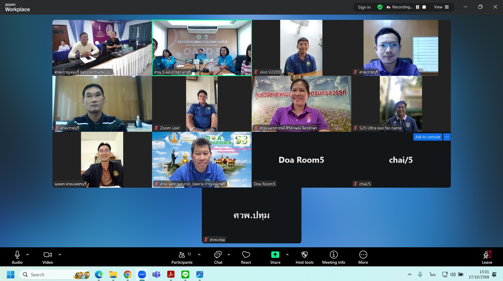 วันที่ 17 ตุลาคม 2568 ดร.อารดา มาสริ ผู้อำนวยการสำนักวิจัยและพัฒนาการเกษตรเขตที่ 5 เป็นประธานการประชุม ประชุมเตรียมความพร้อมพิธีถวายผ้าพระกฐินพระราชทาน กรมวิชาการเกษตร ปี 2568 โดยมีคณะผู้บริหาร และเจ้าหน้าที่ สำนักวิจัยและพัฒนาการเกษตรเขตที่ 5 เข้าร่วมประชุม ณ ห้องประชุมตึกอำนวยการ สำนักวิจัยและพัฒนาการเกษตรเขตที่ 5 อำเภอสรรพยา จังหวัดชัยนาท และผ่านระบบออนไลน์ Zoom Meeting