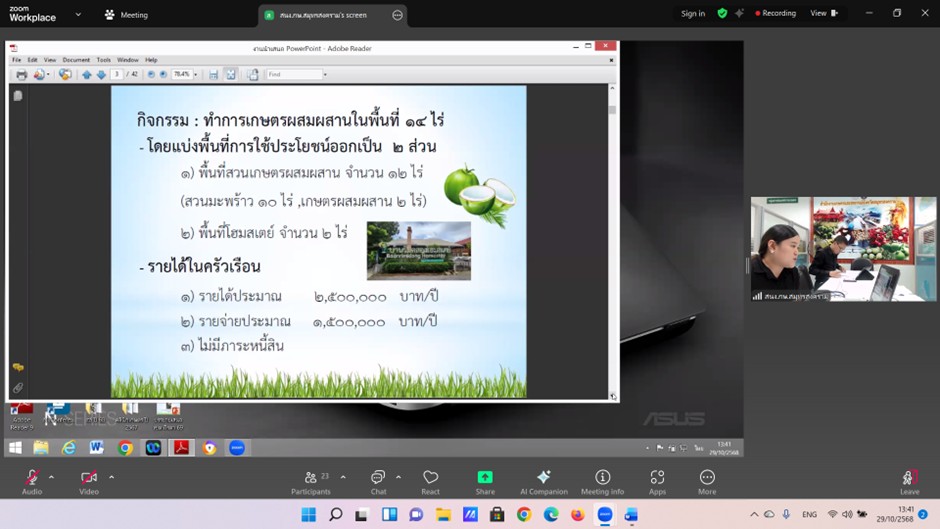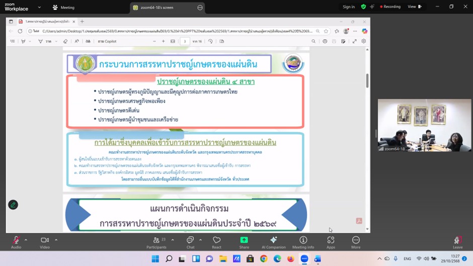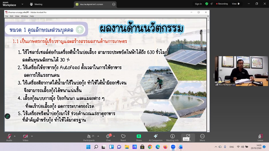 วันที่ 29 ตุลาคม 2568 ดร.อารดา มาสริ ผู้อำนวยการสำนักวิจัยและพัฒนาการเกษตรเขตที่ 5 มอบหมายให้ นางสาวเครือวัลย์ บุญเงิน ผู้เชี่ยวชาญด้านการจัดการผลิตพืชที่เหมาะสมกับสภาพพื้นที่ (ภาคกลาง) สำนักวิจัยและพัฒนาการเกษตรเขตที่ 5 เข้าร่วมประชุมคณะทำงานสรรหาปราชญ์เกษตรของแผ่นดินระดับเขตที่ 4 ประจำปี 2568 โดยมี นางสาวอิงอร ปัญญากิจ ผู้ตรวจราชการกระทรวงเกษตรและสหกรณ์ เป็นประธานการประชุม เพื่อพิจารณาคัดเลือกบุคคลที่สมควรได้รับการแต่งตั้งเชิดชูเกียรติเป็นปราชญ์เกษตรของแผ่นดินระดับเขต ผ่านทางระบบออนไลน์ Zoom Meeting ณ สำนักวิจัยและพัฒนาการเกษตรเขตที่ 5 ต.บางหลวง อ.สรรพยา จ.ชัยนาท