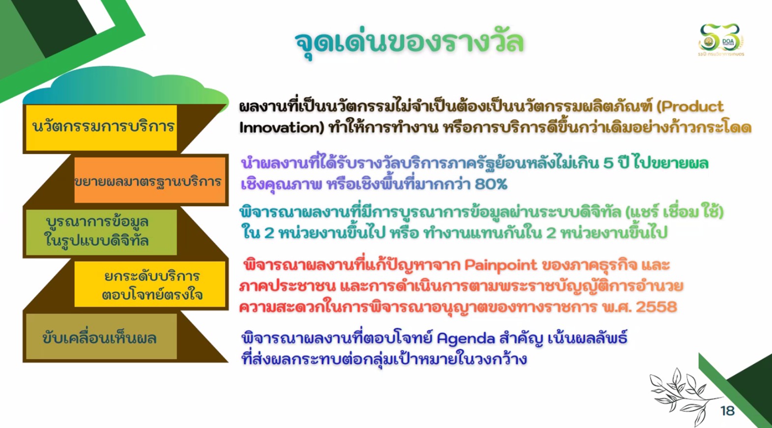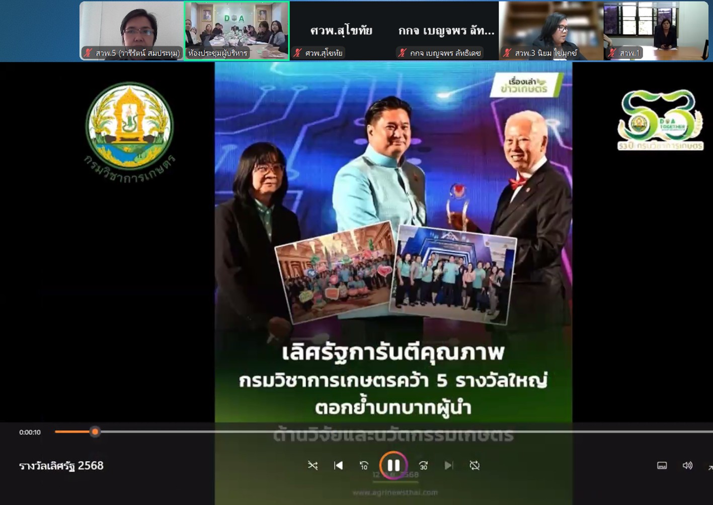 วันที่ 9 ธันวาคม 2568 ดร.อารดา มาสริ ผู้อำนวยการสำนักวิจัยและพัฒนาการเกษตรเขตที่ 5 มอบหมายให้ นางสาวเครือวัลย์ บุญเงิน ผู้เชี่ยวชาญด้านการจัดการผลิตพืชที่เหมาะสมกับสภาพพื้นที่ (ภาคกลาง) และนางสาววารีรัตน์ สมประทุม ผู้อำนวยการกลุ่มวิชาการ เข้าร่วมกิจกรรมการแลกเปลี่ยนเรียนรู้ให้คำแนะนำเกี่ยวกับการส่งผลงานเพื่อขอรับรางวัลเลิศรัฐ ประจำปี 2569 เพื่อถอดบทเรียนปัจจัยที่สำคัญที่ทำให้ผลงานได้รับรางวัล พร้อมข้อเสนอแนะสำหรับการเขียนผลงานเพื่อให้ได้รับรางวัล ผ่านระบบออนไลน์ Application Zoom Meeting