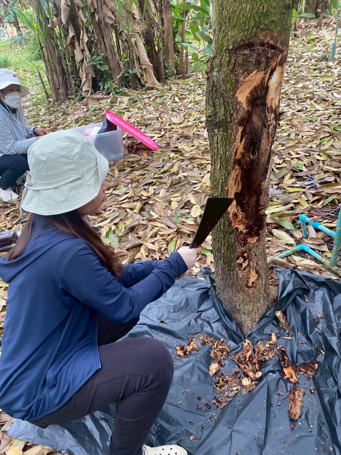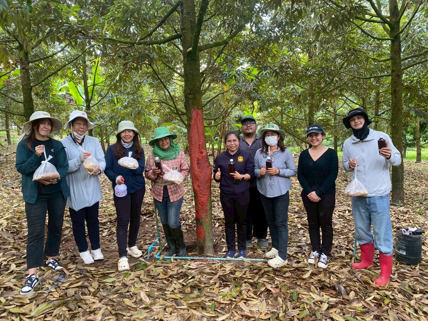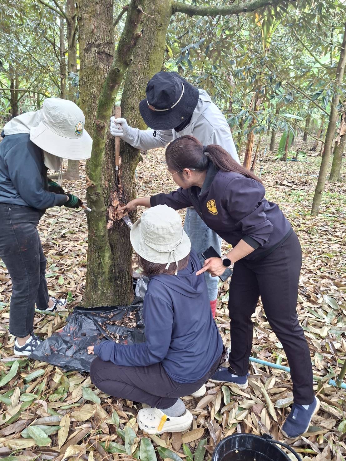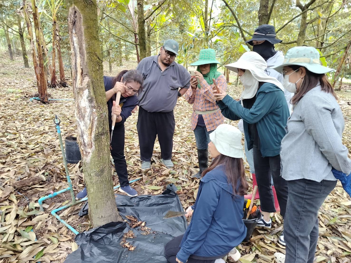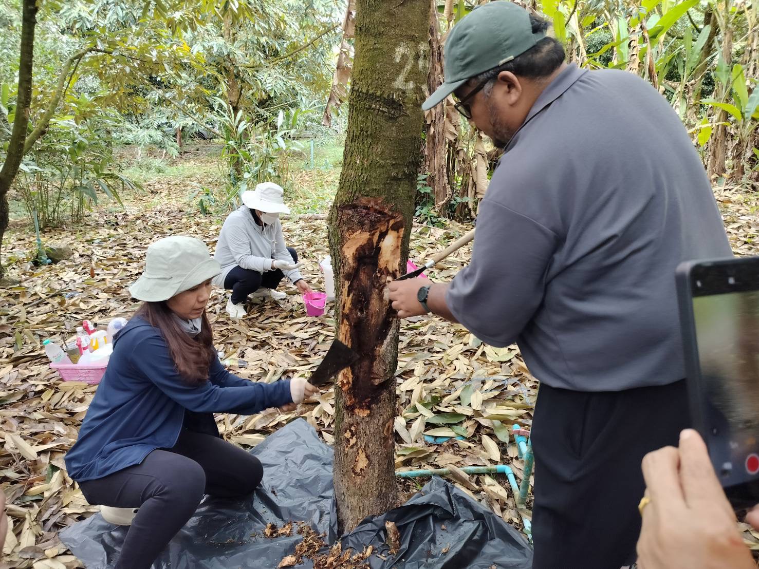 วันที่ 11 ธันวาคม 2568 ดร.อารดา มาสริ ผู้อำนวยการสำนักวิจัยและพัฒนาการเกษตรเขตที่ 5 มอบหมายให้นางสาววัชราสุวรรณ์อาศน์ นักวิชาการเกษตรชำนาญการ นายอุกกฤษ ดวงแก้ว นักวิชาการเกษตรชำนาญการ และเจ้าหน้าที่กลุ่มวิชาการ เข้าแก้ไขปัญหาแปลงทุเรียนที่ประสบปัญหาโรครากเน่าโคนเน่า และเข้าสาธิตการป้องกันกำจัดโดยใช้ชีวภัณฑ์ก้อนเห็ดเรืองแสงสิรินรัศมี และเห็ดเรืองแสงสิรินรัศมีสูตรเหลว ณ สวนเรียนรู้ด้านไม้ผล คุณพยอม สุวรรณ์คล หมู่ 5 ตำบลชะอม อำเภอแก่งคอย จังหวัดสระบุรี โดยมี ดร.สุภาพร สุขโต นักวิชาการเกษตรชำนาญการพิเศษ เจ้าหน้าที่ศูนย์วิจัยและพัฒนาการเกษตรอุทัยธานี ร่วมแก้ไขปัญหา พร้อมทั้งสาธิตและให้ความรู้