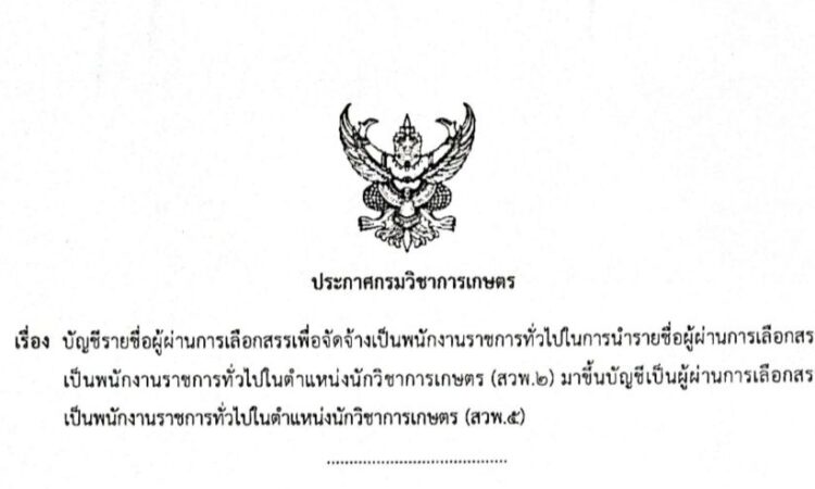 เรื่อง บัญชีรายชื่อผู้ผ่านการเลือกสรรเพื่อจัดจ้างเป็นพนักงานราชการทั่วไปในการนำรายชื่อผู้ผ่านการเลือกสรรเป็นพนักงานราชการทั่วไป ในตำแหน่งนักวิชาการเกษตร (สวพ.2) มาขึ้นบัญชีเป็นผู้ผ่านการเลือกสรรเป็นพนักงานราชการทั่วไป ในตำแหน่งนักวิชาการเกษตร (สวพ.5) |