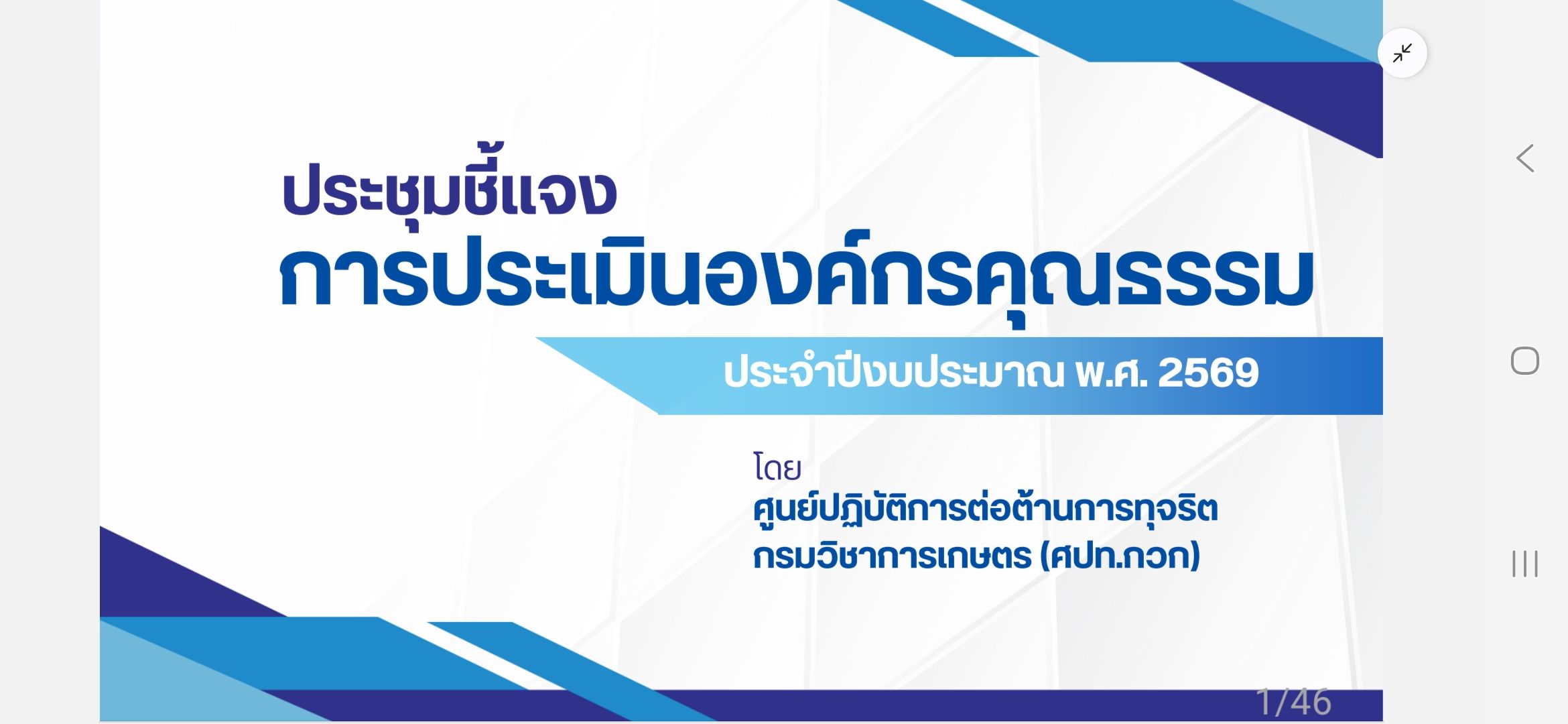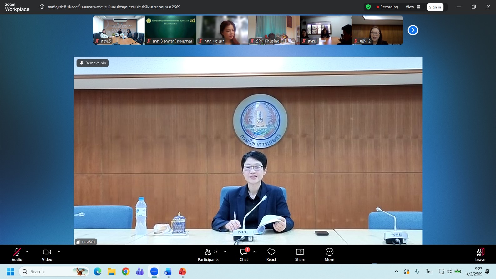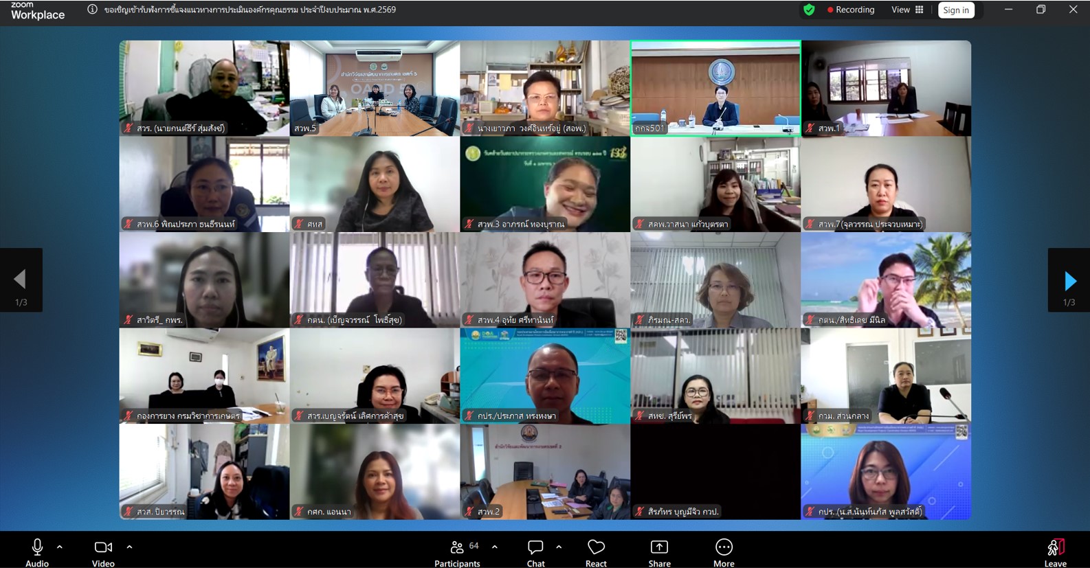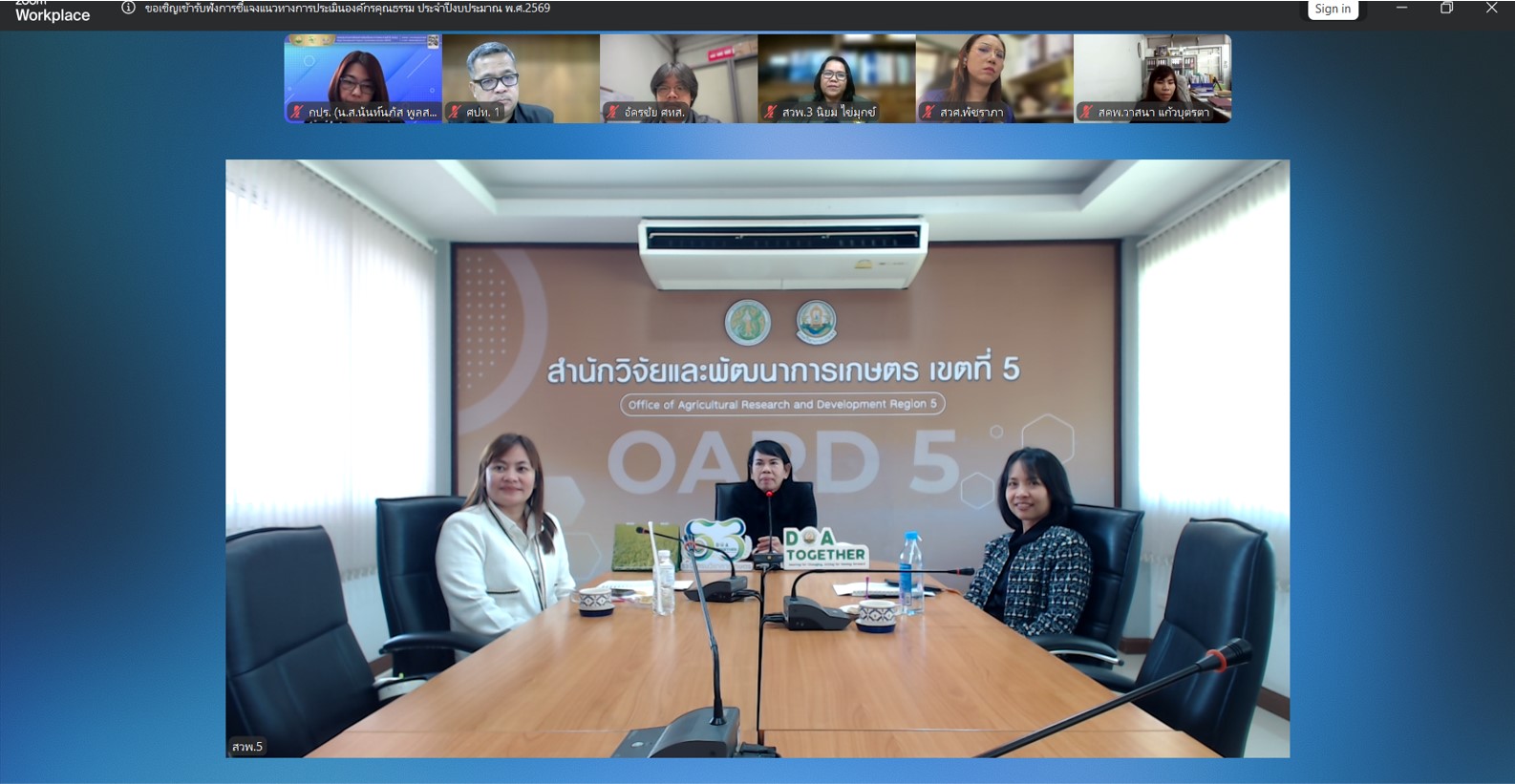วันที่ 4 กุมภาพันธ์ 2569 นางอารดา มาสริ ผู้อำนวยการสำนักวิจัยและพัฒนาการเกษตรเขตที่ 5 พร้อมด้วยนางโสรยา รื่นรวย ผู้อำนวยการกลุ่มประสานและบริหารนโยบาย นางสาวนิศาชล แก้วจันทร์ นักวิชาการเกษตรปฏิบัติการ และนายนำโชค ทาเอื้อ เจ้าหน้าที่ระบบคอมพิวเตอร์ กลุ่มประสานและบริหารนโยบาย เข้าร่วมการประชุมชี้แจงแนวทางการประเมินองค์กรคุณธรรมของกรมวิชาการเกษตร ประจำปีงบประมาณ พ.ศ. 2569 โดยมีนางสาวปรียานุช ทิพยวัฒน์ รองอธิบดีกรมวิชาการเกษตร เป็นประธานในการประชุม ผ่านระบบสื่ออิเล็กทรอนิกส์ (Application Zoom) ณ ห้องประชุมอาคารอำนวยการ สำนักวิจัยและพัฒนาการเกษตรเขตที่ 5 อำเภอสรรพยา จังหวัดชัยนาท