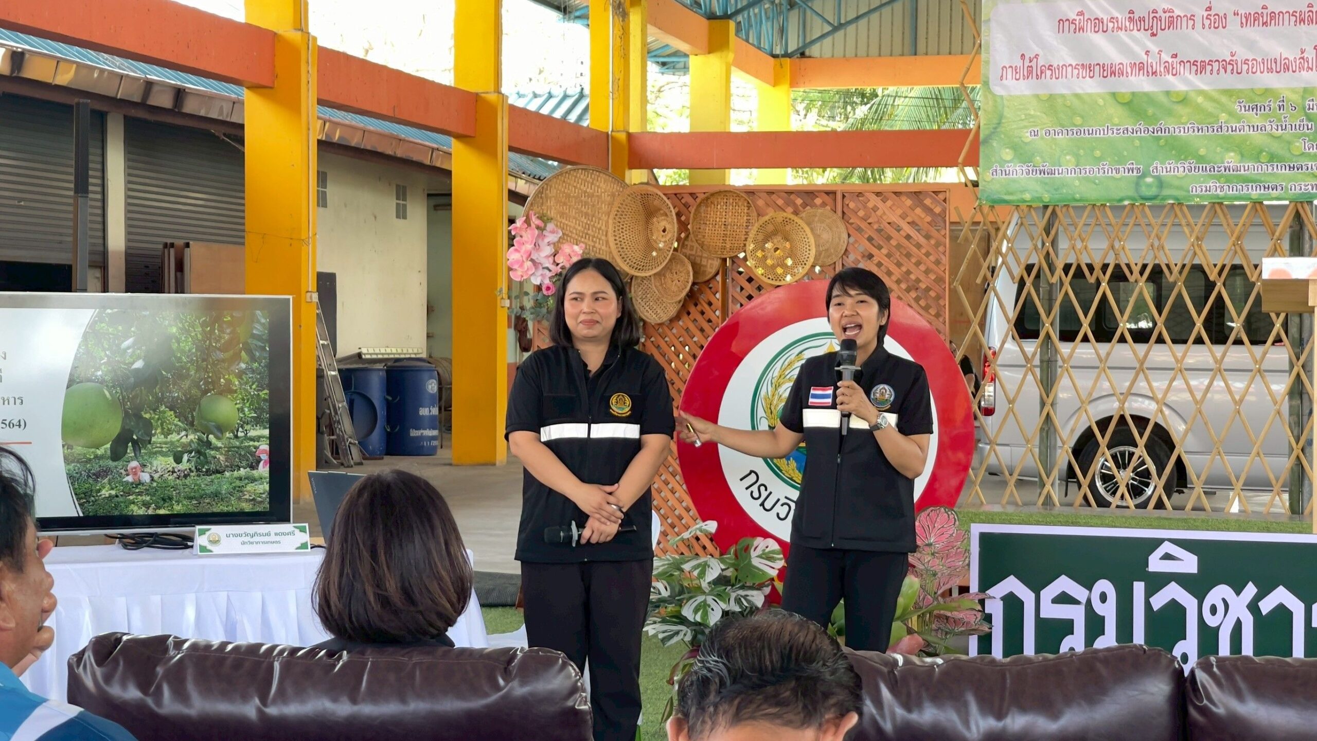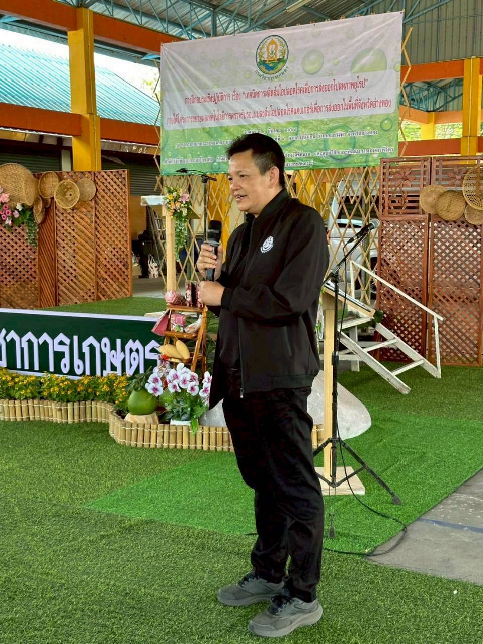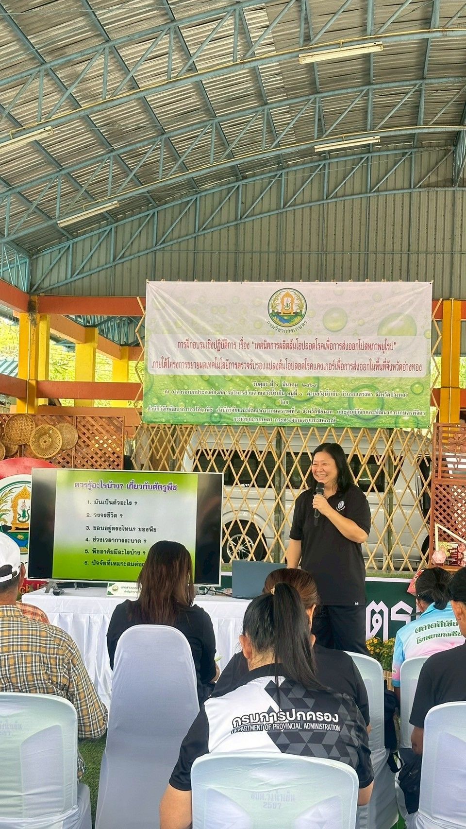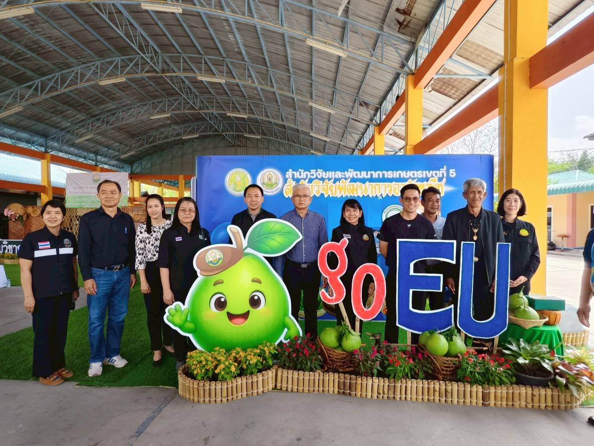 วันที่ 6 มีนาคม 2569 ดร.อารดา มาสริ ผู้อำนวยการสำนักวิจัยและพัฒนาการเกษตรเขตที่ 5 พร้อมด้วยนางอรัญญา บุญใส ผู้อำนวยกลุ่มถ่ายทอดเทคโนโลยี น.ส.วารีรัตน์ สมประทุม ผู้อำนวยการกลุ่มวิชาการ และเจ้าหน้าที่ ร่วมจัดฝึกอบรมเชิงปฏิบัติการ “เทคนิคการผลิตส้มโอปลอดโรคเพื่อการส่งออกไปสหภาพยุโรป” ให้กับเกษตรกรและผู้สนใจ อ.แสวงหา จ.อ่างทอง โดยมี นายกรวีร์ ปริศนานันทกุล สมาชิกสภาผู้แทนราษฎรเขต 2 จังหวัดอ่างทอง เป็นประธานเปิดการฝึกอบรม ดร.สิทธิศักดิ์ แสไพศาล ผู้อำนวยการกลุ่มวิจัยโรคพืช สำนักวิจัยพัฒนาการอารักขาพืช หัวหน้าโครงการกล่าวรายงาน ณ องค์การบริหารส่วนตำบลวังน้ำเย็น อำเภอแสวงหา จังหวัดอ่างทอง เพื่อถ่ายทอดองค์ความรู้และเทคโนโลยีการควบคุมศัตรูพืชที่สำคัญของส้มโออย่างถูกวิธี ระเบียบการส่งออกส้มโอไปสู่สหภาพยุโรปและกระบวนการผลิตส้มโอคุณภาพตามมาตรฐานสหภาพยุโรป พร้อมลงพื้นที่แปลงปลูกส้มโอเพื่อฝึกปฏิบัติวิธีการจัดการโรคแคงเกอร์อย่างถูกวิธีให้กับเกษตรกรที่เข้าร่วมโครงการแปลงใหญ่ส้มโอ รวมทั้งนักวิชาการของหน่วยงานในพื้นที่ จำนวน 60 ราย