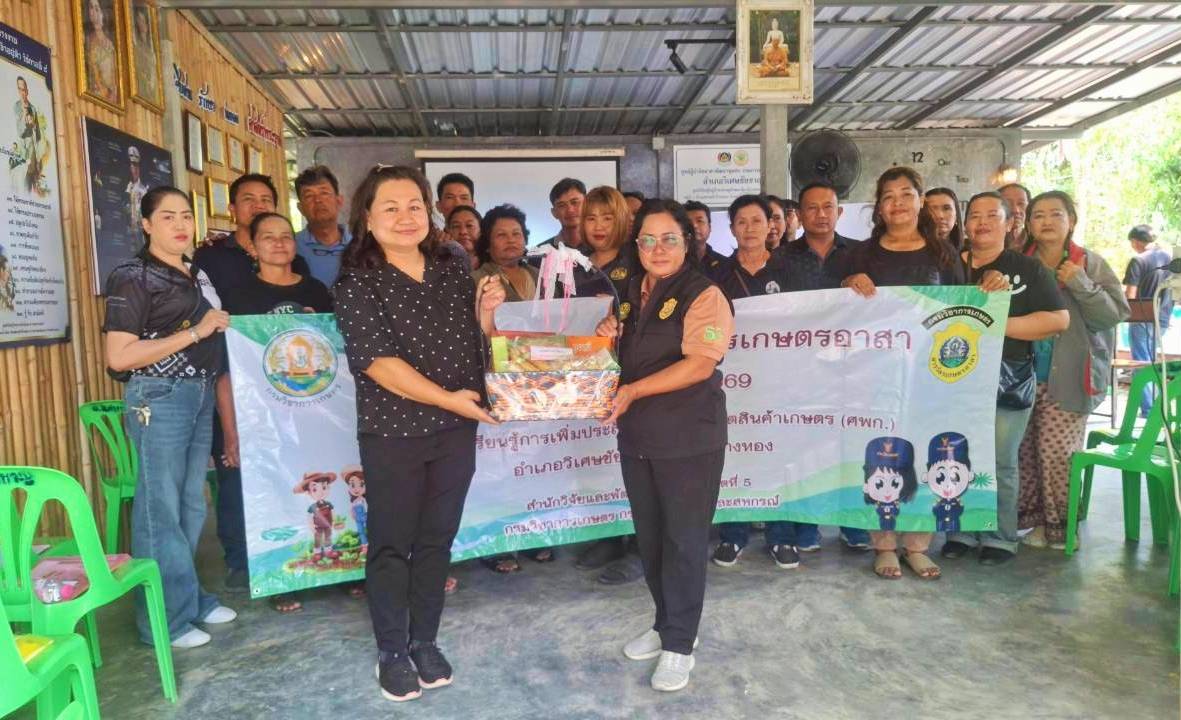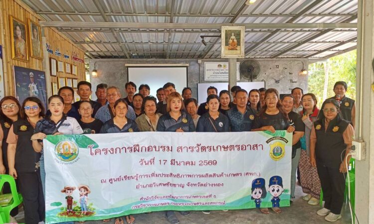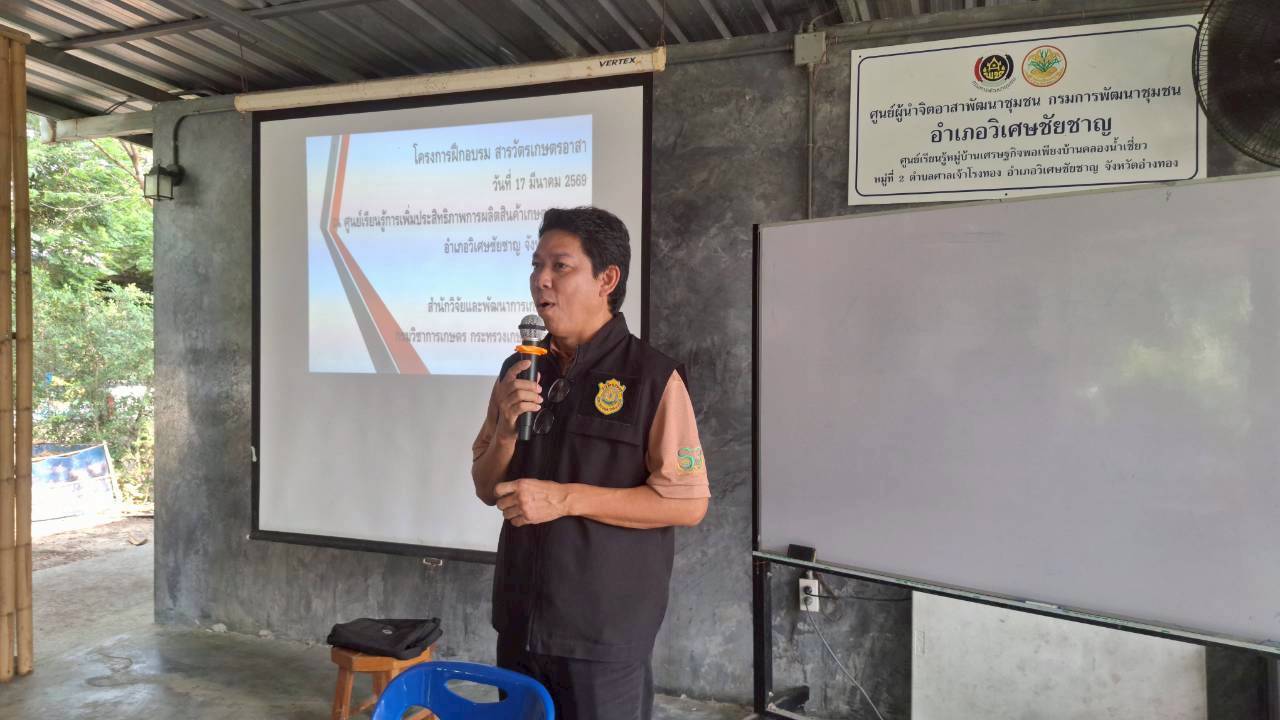 วันที่ 17 มีนาคม 2569 ดร.อารดา มาสริ ผู้อำนวยการสำนักงานวิจัยและพัฒนาการเกษตรเขตที่ 5 มอบหมายให้นายชัยวัฒน์ กะการดี นักวิชาการเกษตรปฏิบัติการ นายสถาพร ใส้พงษ์ เจ้าพนักงานการเกษตรชำนาญงาน นางสาวชนาภัทร นาคา เจ้าพนักงานการเกษตรชำนาญงาน และเจ้าหน้าที่กลุ่มควบคุมตามพระราชบัญญัติ สำนักงานวิจัยและพัฒนาการเกษตรเขตที่ 5 จัดฝึกอบรมหลักสูตรสารวัตรเกษตรอาสา ภายใต้โครงการศูนย์เรียนรู้การเพิ่มประสิทธิภาพการผลิตสินค้าเกษตร ประจำปีงบประมาณ 2569 โดยมีอาสาสมัครเกษตรสาขาต่างๆ (อกษ.) อาสาสมัครเกษตรหมู่บ้าน (อกม.) และประธานศูนย์เรียนรู้การเพิ่มประสิทธิภาพการผลิตสินค้าเกษตร (ศพก.) เข้าร่วมอบรมจำนวน 30 ราย ณ ศูนย์เรียนรู้การเพิ่มประสิทธิภาพการผลิตสินค้าเกษตร (ศพก.) อำเภอวิเศษชัยชาญ จังหวัดอ่างทอง