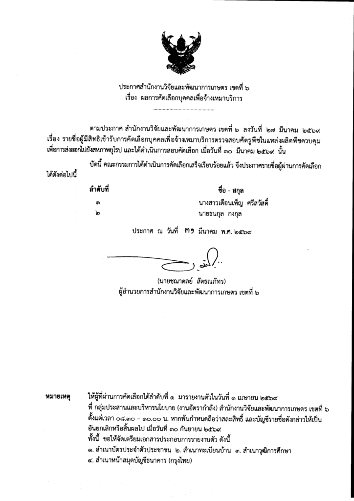 ประกาศผลการคัดเลือกบุคคลเพื่อจ้างเหมาบริการตรวจสอบศัตรูพืชในแหล่งผลิตพืชควบคุมเพื่อการส่งออกไปยังสหภาพยุโรป 31 มีนาคม 2026 admin ข่าว, ข่าวการสอบ สมัครงาน