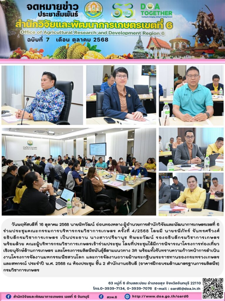 วันพฤหัสบดีที่ 16 ตุลาคม 2568 นายพิทวัฒน์ อ่อนทองหลาง ผู้อำนวยการสำนักวิจัยและพัฒนาการเกษตรเขตที่ 6 ร่วมประชุมคณะกรรมการบริหารกรมวิชาการเกษตร ครั้งที่ 4/2568 โดยมี นายรพีภัทร์ จันทรศรีวงศ์ อธิบดีกรมวิชาการเกษตร เป็นประธาน นางสาวปรียานุช ทิพยะวัฒน์ รองอธิบดีกรมวิชาการเกษตร พร้อมด้วย คณะผู้บริหารกรมวิชาการเกษตรเข้าร่วมประชุม โดยที่ประชุมได้มีการพิจารณาโครงการท่องเที่ยวเชิงอนุรักษ์ด้านการเกษตร และโครงการผลิตพืชพันธุ์ดีตามแนวทาง 3R พร้อมทั้งรับทราบความก้าวหน้าการดำเนินงานโครงการจัดงานมหกรรมพืชสวนโลก และการจัดงานถวายผ้าพระกฐินพระราชทานของกระทรวงเกษตรและสหกรณ์ ประจำปี พ.ศ. 2568 ณ ห้องประชุม ชั้น 2 สำนักงานอธิบดี (อาคารฝึกอบรมด้านมาตรฐานการผลิตพืช) กรมวิชาการเกษตร