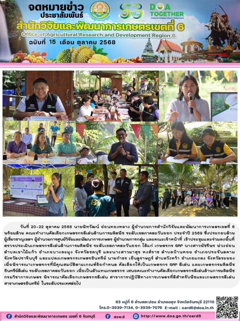 วันที่ 20-22 ตุลาคม 2568 นายพิทวัฒน์ อ่อนทองหลาง ผู้อำนวยการสำนักวิจัยและพัฒนาการเกษตรเขตที่ 6 พร้อมด้วย คณะทำงานคัดเลือกเกษตรกรดีเด่นด้านการผลิตพืช ระดับเขตภาคตะวันออก ประจำปี 2569 ซึ่งประกอบด้วย ผู้เชี่ยวชาญเขตฯ ผู้อำนวยการศูนย์วิจัยและพัฒนาการเกษตร ผู้อำนวยการกลุ่ม และคณะเจ้าหน้าที่ เข้าประชุมและร่วมลงพื้นที่ตรวจประเมินเกษตรกรดีเด่นด้านการผลิตพืช ระดับเขตภาคตะวันออก ได้แก่ เกษตรกร GAP นางสาวพัชรีพร พ่วงอ่อน ตำบลเขาไม้แก้ว อำเภอบางละมุง จังหวัดชลบุรี และนางสาวผาสุข หงส์ราช ตำบลบ้านหอย อำเภอประจันตคาม จังหวัดปราจีนบุรี และแปลงเกษตรกรเกษตรอินทรีย์ นายกำธร เอ็นดูราษฎร์ ตำบลวังหว้า อำเภอแกลง จังหวัดระยอง เพื่อพิจารณาเกษตรกรที่มีคุณสมบัติตามเกณฑ์ข้อกำหนด คัดเลือกให้เป็นเกษตรกร GAP ดีเด่น และเกษตรกรผลิตพืช อินทรีย์ดีเด่น ระดับเขตภาคตะวันออก เพื่อเป็นตัวแทนเกษตรกร เสนอคณะทำงานคัดเลือกเกษตรกรดีเด่นด้านการผลิตพืช กรมวิชาการเกษตร พิจารณาคัดเลือกเกษตรกรดีเด่น สาขาการปฏิบัติทางการเกษตรที่ดีสำหรับพืชและเกษตรกรดีเด่น สาขาเกษตรอินทรีย์ ในระดับประเทศต่อไป