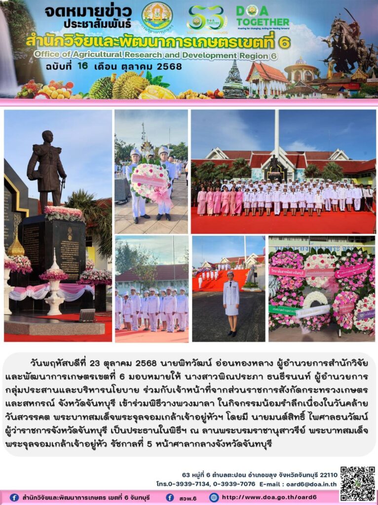 สวพ.6 ร่วมกับเจ้าหน้าที่จากส่วนราชการสังกัดกระทรวงเกษตรและสหกรณ์ จังหวัดจันทบุรี เข้าร่วมพิธีวางพวงมาลา ในกิจกรรมน้อมรำลึกเนื่องในวันคล้ายวันสวรรคต พระบาทสมเด็จพระจุลจอมเกล้าเจ้าอยู่หัวฯ 23 ตุลาคม 2025 admin กิจกรรม สวพ.6, ข่าว วันพฤหัสบดีที่ 23 ตุลาคม 2568 นายพิทวัฒน์ อ่อนทองหลาง ผู้อำนวยการสำนักวิจัยและพัฒนาการเกษตรเขตที่ 6 มอบหมายให้ นางสาวพิณประภา ธนธีรนนท์ ผู้อำนวยการกลุ่มประสานและบริหารนโยบาย ร่วมกับเจ้าหน้าที่จากส่วนราชการสังกัดกระทรวงเกษตรและสหกรณ์ จังหวัดจันทบุรี เข้าร่วมพิธีวางพวงมาลา ในกิจกรรมน้อมรำลึกเนื่องในวันคล้ายวันสวรรคต พระบาทสมเด็จพระจุลจอมเกล้าเจ้าอยู่หัวฯ โดยมี นายมนต์สิทธิ์ ไพศาลธนวัฒน์ ผู้ว่าราชการจังหวัดจันทบุรี เป็นประธานในพิธีฯ ณ ลานพระบรมราชานุสาวรีย์ พระบาทสมเด็จพระจุลจอมเกล้าเจ้าอยู่หัว รัชกาลที่ 5 หน้าศาลากลางจังหวัดจันทบุรี FacebookFacebookXXLINELine
