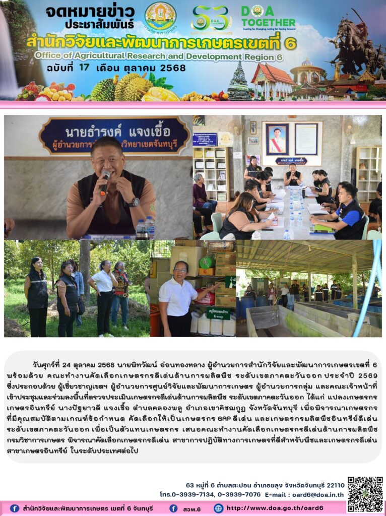 วันศุกร์ที่ 24 ตุลาคม 2568 นายพิทวัฒน์ อ่อนทองหลาง ผู้อำนวยการสำนักวิจัยและพัฒนาการเกษตรเขตที่ 6 พร้อมด้วย คณะทำงานคัดเลือกเกษตรกรดีเด่นด้านการผลิตพืช ระดับเขตภาคตะวันออก ประจำปี 2569 ซึ่งประกอบด้วย ผู้เชี่ยวชาญเขตฯ ผู้อำนวยการศูนย์วิจัยและพัฒนาการเกษตร ผู้อำนวยการกลุ่ม และคณะเจ้าหน้าที่ เข้าประชุมและร่วมลงพื้นที่ตรวจประเมินเกษตรกรดีเด่นด้านการผลิตพืช ระดับเขตภาคตะวันออก ได้แก่ แปลงเกษตรกรเกษตรอินทรีย์ นางปัฐยาวดี แจงเชื้อ ตำบลคลองพลู อำเภอเขาคิชฌกูฏ จังหวัดจันทบุรี เพื่อพิจารณาเกษตรกร ที่มีคุณสมบัติตามเกณฑ์ข้อกำหนด คัดเลือกให้เป็นเกษตรกร GAP ดีเด่น และเกษตรกรผลิตพืชอินทรีย์ดีเด่นระดับเขตภาคตะวันออก เพื่อเป็นตัวแทนเกษตรกร เสนอคณะทำงานคัดเลือกเกษตรกรดีเด่นด้านการผลิตพืช กรมวิชาการเกษตร พิจารณาคัดเลือกเกษตรกรดีเด่น สาขาการปฏิบัติทางการเกษตรที่ดีสำหรับพืชและเกษตรกรดีเด่นสาขาเกษตรอินทรีย์ ในระดับประเทศต่อไป