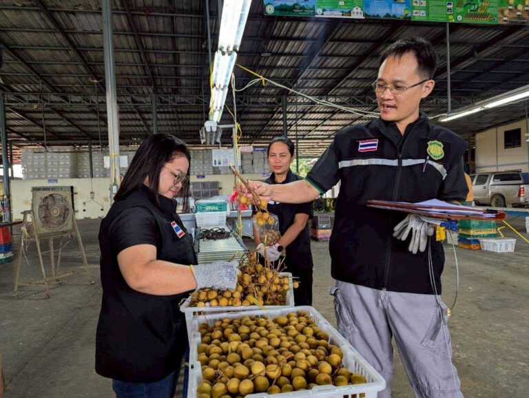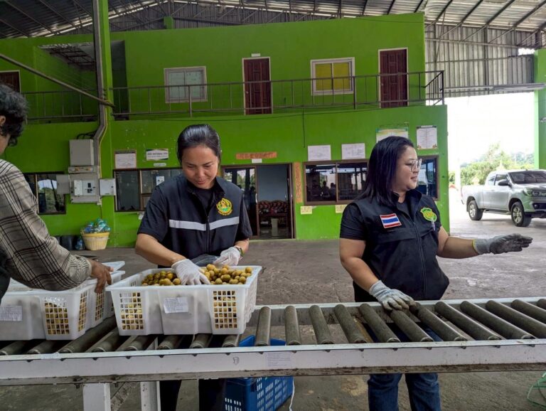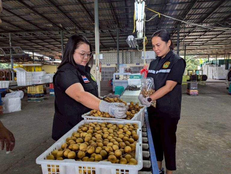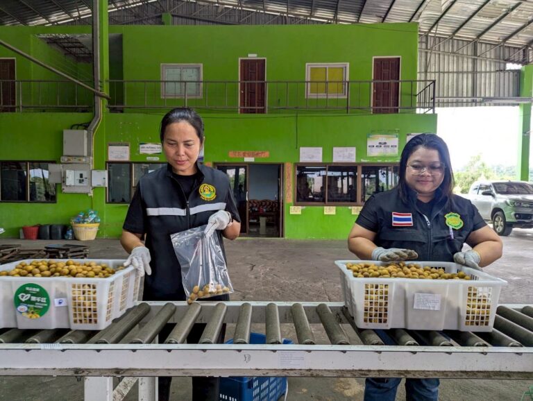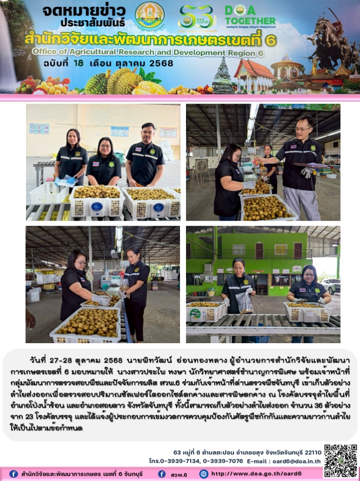 เจ้าหน้าที่กลุ่มพัฒนาการตรวจสอบพืชและปัจจัยการผลิต สวพ.6 ร่วมกับเจ้าหน้าที่ด่านตรวจพืชจันทบุรี เข้าเก็บตัวอย่างลำไยส่งออกเพื่อตรวจสอบปริมาณซัลเฟอร์ไดออกไซด์ตกค้างและสารพิษตกค้าง ณ โรงคัดบรรจุลำไยพื้นที่อำเภอโป่งน้ำร้อน และอำเภอสอยดาว จังหวัดจันทบุรี 28 ตุลาคม 2025 admin กิจกรรม สวพ.6, ข่าว วันที่ 27-28 ตุลาคม 2568-นายพิทวัฒน์-อ่อนทองหลาง-ผู้อำนวยการสำนักวิจัยและพัฒนาการเกษตรเขตที่ 6 มอบหมายให้ขนางสาวประไพ หงษา นักวิทยาศาสตร์ชำนาญการพิเศษ พร้อมเจ้าหน้าที่กลุ่มพัฒนาการตรวจสอบพืชและปัจจัยการผลิต สวพ.6 ร่วมกับเจ้าหน้าที่ด่านตรวจพืชจันทบุรี เข้าเก็บตัวอย่างลำไยส่งออกเพื่อตรวจสอบปริมาณซัลเฟอร์ไดออกไซด์ตกค้างและสารพิษตกค้าง ณ โรงคัดบรรจุลำไยพื้นที่อำเภอโป่งน้ำร้อน และอำเภอสอยดาว จังหวัดจันทบุรี ทั้งนี้สามารถเก็บตัวอย่างลำไยส่งออก จำนวน 36 ตัวอย่าง จาก 23 โรงคัดบรรจุ และได้แจ้งผู้ประกอบการเข้มงวดการควบคุมป้องกันศัตรูพืชกักกันและความยาวก้านลำไยให้เป็นไปตามข้อกำหนด FacebookFacebookXXLINELine