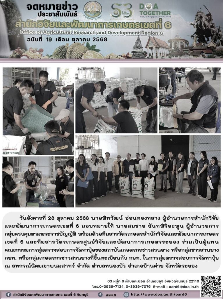 ทีมสารวัตรเกษตรสำนักวิจัยและพัฒนาการเกษตรเขตที่ 6 และทีมสารวัตรเกษตรศูนย์วิจัยและพัฒนาการเกษตรระยอง ร่วมเป็นผู้แทนคณะกรรมการสุ่มตรวจสอบการจัดหาปุ๋ยของสถาบันเกษตรกรชาวสวนยาง หรือกลุ่มชาวสวนยาง กยท. 28 ตุลาคม 2025 admin กิจกรรม สวพ.6, ข่าว วันอังคารที่ 28 ตุลาคม 2568 นายพิทวัฒน์ อ่อนทองหลาง ผู้อำนวยการสำนักวิจัยและพัฒนาการเกษตรเขตที่ 6 มอบหมายให้ นายสมชาย ฉันทพิริยะพูน ผู้อำนวยการ กลุ่มควบคุมตามพระราชบัญญัติ พร้อมด้วยทีมสารวัตรเกษตรสำนักวิจัยและพัฒนาการเกษตรเขตที่ 6 และทีมสารวัตรเกษตรศูนย์วิจัยและพัฒนาการเกษตรระยอง ร่วมเป็นผู้แทนคณะกรรมการสุ่มตรวจสอบการจัดหาปุ๋ยของสถาบันเกษตรกรชาวสวนยาง หรือกลุ่มชาวสวนยาง กยท. หรือกลุ่มเกษตรกรชาวสวนยางที่ขึ้นทะเบียนกับ กยท. ในการสุ่มตรวจสอบการจัดหาปุ๋ย ณ สหกรณ์นิคมเขาพนมสาทร์ จำกัด ตำบลหนองบัว อำเภอบ้านค่าย จังหวัดระยอง FacebookFacebookXXLINELine