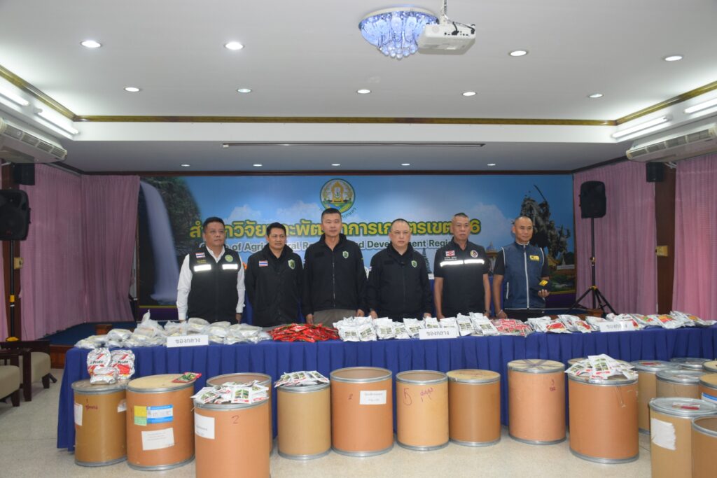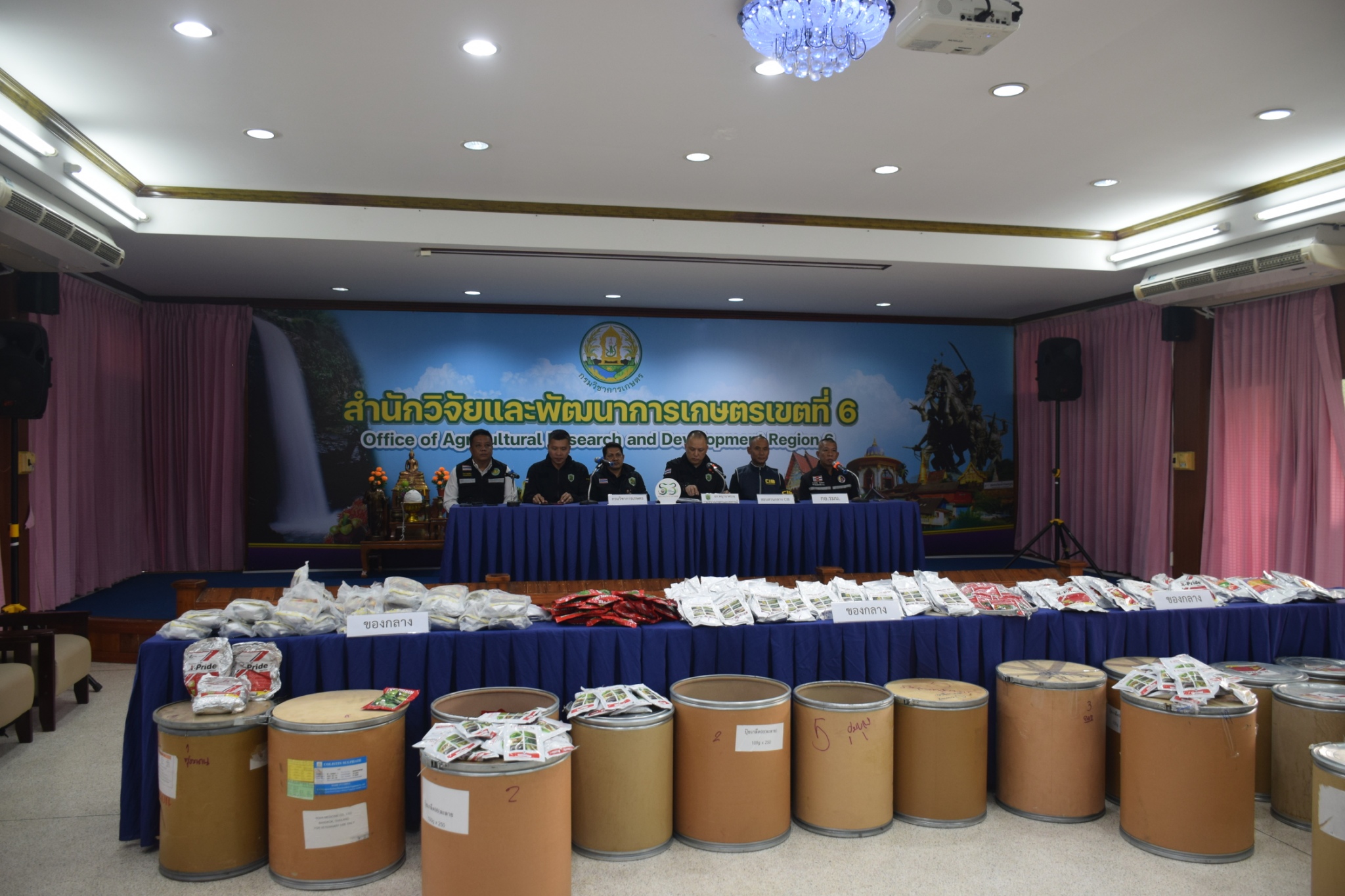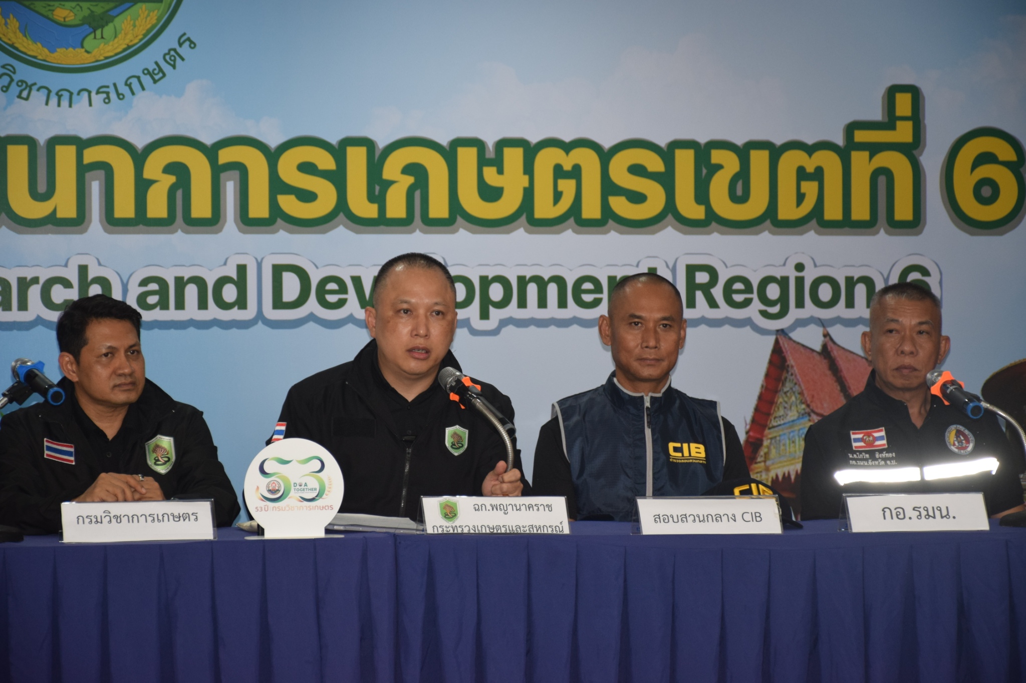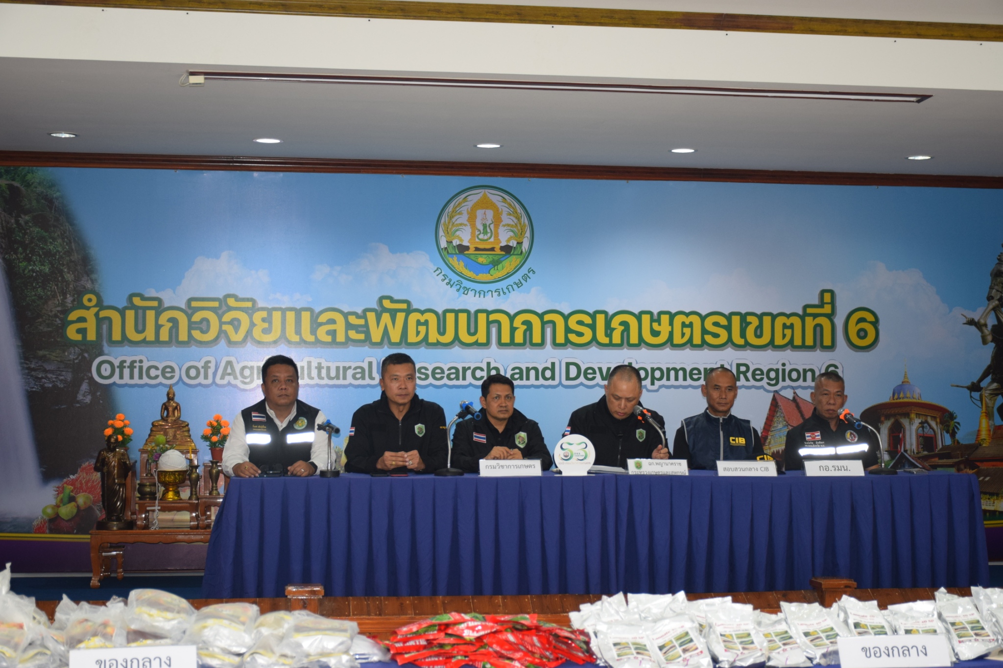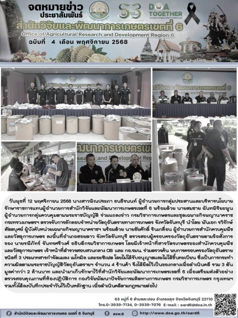 วันพุธที่ 12 พฤศจิกายน 2568 นางสาวพิณประภา ธนธีรนนท์ ผู้อำนวยการกลุ่มประสานและบริหารนโยบายรักษาราชการแทนผู้อำนวยการสำนักวิจัยและพัฒนาการเกษตรเขตที่ 6 พร้อมด้วย นายสมชาย ฉันทพิริยะพูน ผู้อำนวยการกลุ่มควบคุมตามพระราชบัญญัติ ร่วมแถลงข่าว กรมวิชาการเกษตรและชุดเฉพาะกิจพญานาคราช กระทรวงเกษตรฯ ตรวจจับการลักลอบจำหน่ายวัตถุอันตรายทางการเกษตร จังหวัดจันทบุรี นำโดย พันเอก รวิรักษ์ สัตตบุศย์ ผู้บังคับหน่วยเฉพาะกิจพญานาคราชฯ พร้อมด้วย นายชัยศักดิ์ รินเกลื่อน ผู้อำนวยการสำนักควบคุมพืชและวัสดุการเกษตร ลงพื้นที่อำเภอสอยดาว จังหวัดจันทบุรี ตรวจสอบผู้ครอบครองวัตถุอันตรายตามข้อสั่งการของ นายรพีภัทร์ จันทรศรีวงศ์ อธิบดีกรมวิชาการเกษตร โดยมีเจ้าหน้าที่สารวัตรเกษตรของสำนักควบคุมพืชและวัสดุการเกษตร เจ้าหน้าที่ตำรวจสอบสวนกลาง CIB และ กอ.รมน. ร่วมตรวจค้น พบการครอบครองวัตถุอันตรายชนิดที่ 3 ประเภทสารกำจัดแมลง เมโทมิล และอะซิเฟต โดยไม่ได้รับอนุญาตและไม่ได้ขึ้นทะเบียน ซึ่งเป็นการกระทำความผิดตามพระราชบัญญัติวัตถุอันตรายฯ จำนวน 4 ร้านค้า จึงได้ยึดไว้เป็นของกลางเพื่อดำเนินคดี รวม 3 ตัน มูลค่ากว่า 2 ล้านบาท และนำมาเก็บรักษาไว้ที่สำนักวิจัยและพัฒนาการเกษตรเขตที่ 6 เพื่อเตรียมส่งตัวอย่างตรวจสอบคุณภาพที่ห้องปฏิบัติการ กองวิจัยพัฒนาปัจจัยการผลิตทางการเกษตร กรมวิชาการเกษตร กรุงเทพฯ รวมทั้งได้ลงบันทึกประจำวันไว้เป็นหลักฐาน เพื่อดำเนินคดีตามกฎหมายต่อไป