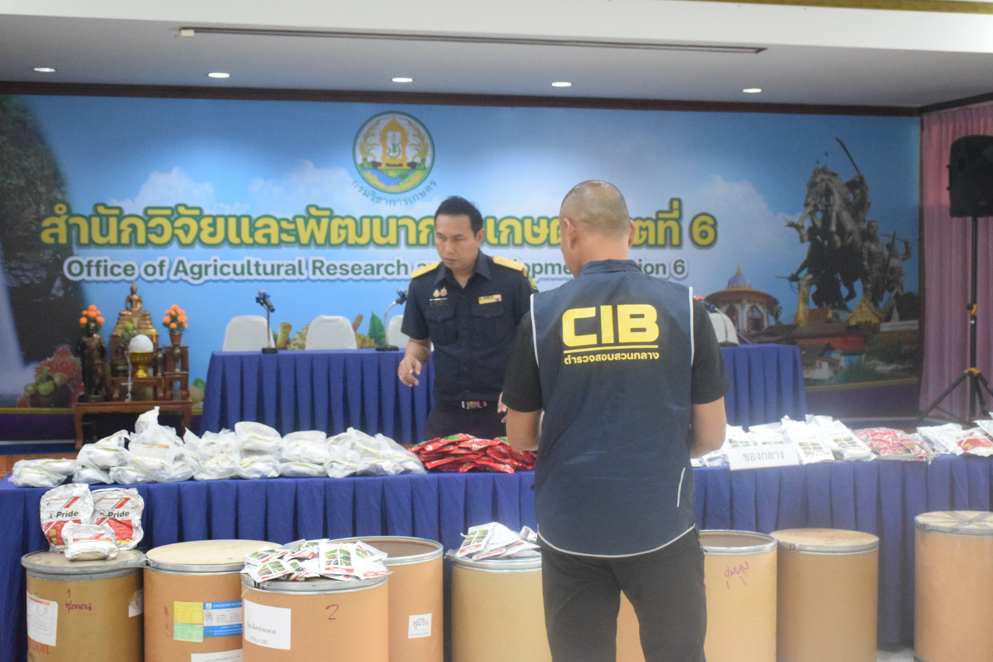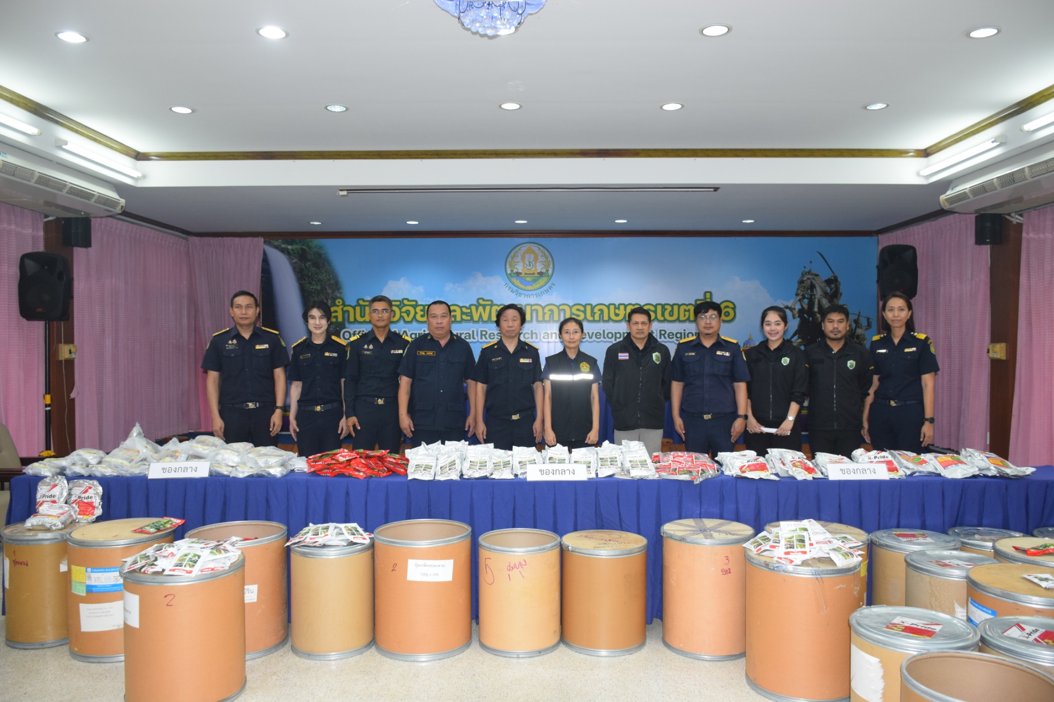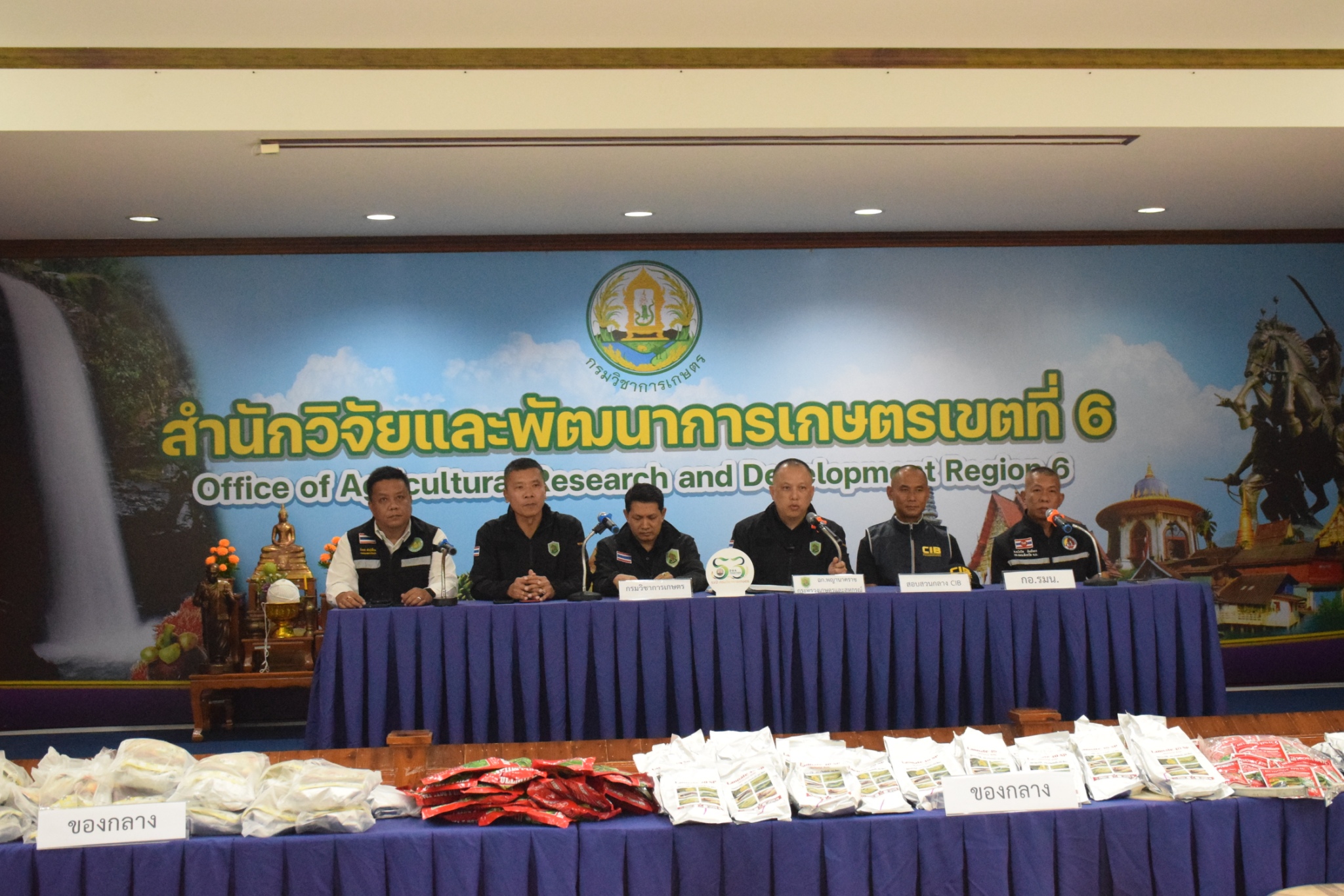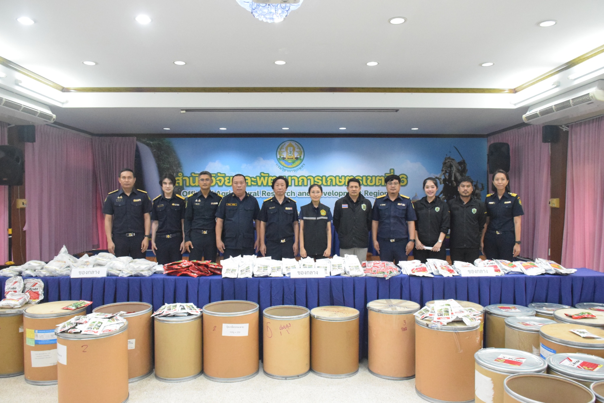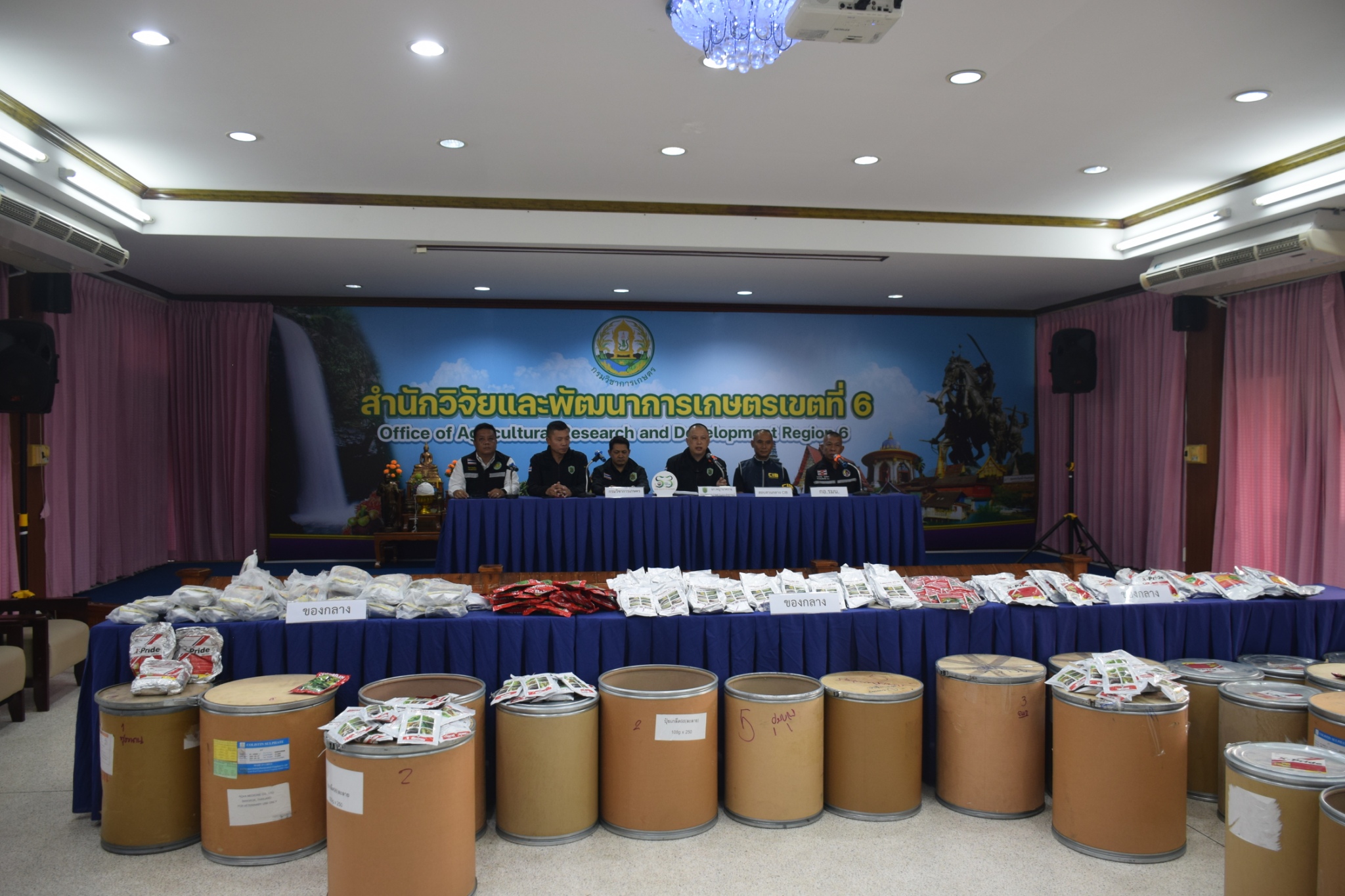 วันพุธที่ 12 พฤศจิกายน 2568 นางสาวพิณประภา ธนธีรนนท์ ผู้อำนวยการกลุ่มประสานและบริหารนโยบายรักษาราชการแทนผู้อำนวยการสำนักวิจัยและพัฒนาการเกษตรเขตที่ 6 พร้อมด้วย นายสมชาย ฉันทพิริยะพูน ผู้อำนวยการกลุ่มควบคุมตามพระราชบัญญัติ ร่วมแถลงข่าว กรมวิชาการเกษตรและชุดเฉพาะกิจพญานาคราช กระทรวงเกษตรฯ ตรวจจับการลักลอบจำหน่ายวัตถุอันตรายทางการเกษตร จังหวัดจันทบุรี นำโดย พันเอก รวิรักษ์ สัตตบุศย์ ผู้บังคับหน่วยเฉพาะกิจพญานาคราชฯ พร้อมด้วย นายชัยศักดิ์ รินเกลื่อน ผู้อำนวยการสำนักควบคุมพืชและวัสดุการเกษตร ลงพื้นที่อำเภอสอยดาว จังหวัดจันทบุรี ตรวจสอบผู้ครอบครองวัตถุอันตรายตามข้อสั่งการของ นายรพีภัทร์ จันทรศรีวงศ์ อธิบดีกรมวิชาการเกษตร โดยมีเจ้าหน้าที่สารวัตรเกษตรของสำนักควบคุมพืชและวัสดุการเกษตร เจ้าหน้าที่ตำรวจสอบสวนกลาง CIB และ กอ.รมน. ร่วมตรวจค้น พบการครอบครองวัตถุอันตรายชนิดที่ 3 ประเภทสารกำจัดแมลง เมโทมิล และอะซิเฟต โดยไม่ได้รับอนุญาตและไม่ได้ขึ้นทะเบียน ซึ่งเป็นการกระทำความผิดตามพระราชบัญญัติวัตถุอันตรายฯ จำนวน 4 ร้านค้า จึงได้ยึดไว้เป็นของกลางเพื่อดำเนินคดี รวม 3 ตัน มูลค่ากว่า 2 ล้านบาท และนำมาเก็บรักษาไว้ที่สำนักวิจัยและพัฒนาการเกษตรเขตที่ 6 เพื่อเตรียมส่งตัวอย่างตรวจสอบคุณภาพที่ห้องปฏิบัติการ กองวิจัยพัฒนาปัจจัยการผลิตทางการเกษตร กรมวิชาการเกษตร กรุงเทพฯ รวมทั้งได้ลงบันทึกประจำวันไว้เป็นหลักฐาน เพื่อดำเนินคดีตามกฎหมายต่อไป
