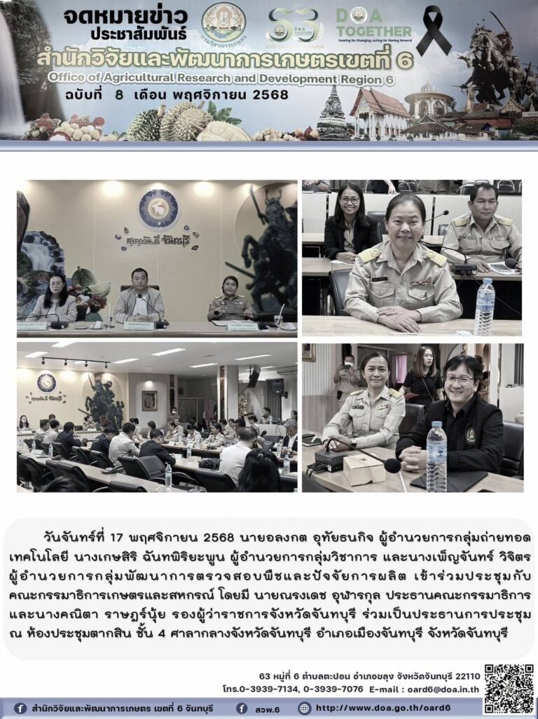 สวพ.6 เข้าร่วมประชุมกับคณะกรรมาธิการเกษตรและสหกรณ์ 17 พฤศจิกายน 2025 admin กิจกรรม สวพ.6, ข่าว วันจันทร์ที่ 17 พฤศจิกายน 2568 นายอลงกต อุทัยธนกิจ ผู้อำนวยการกลุ่มถ่ายทอดเทคโนโลยี นางเกษสิริ ฉันทพิริยะพูน ผู้อำนวยการกลุ่มวิชาการ และนางเพ็ญจันทร์ วิจิตร ผู้อำนวยการกลุ่มพัฒนาการตรวจสอบพืชและปัจจัยการผลิต เข้าร่วมประชุมกับคณะกรรมาธิการเกษตรและสหกรณ์ โดยมี นายณรงเดช อุฬารกุล ประธานคณะกรรมาธิการ และนางคณิตา ราษฎร์นุ้ย รองผู้ว่าราชการจังหวัดจันทบุรี ร่วมเป็นประธานการประชุม ณ ห้องประชุมตากสิน ชั้น 4 ศาลากลางจังหวัดจันทบุรี อำเภอเมืองจันทบุรี จังหวัดจันทบุรี FacebookFacebookXXLINELine