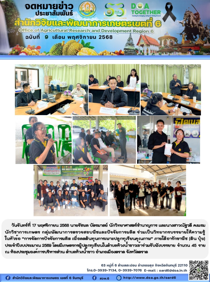 สวพ.6 ร่วมเป็นวิทยากรบรรยายให้ความรู้ ในหัวข้อ “การจัดการปัจจัยการผลิต เพื่อลดต้นทุนการเพาะปลูกทุเรียนคุณภาพ” ภายใต้อารักขาพืช (ดิน ปุ๋ย)ประจำปีงบประมาณ 2569 17 พฤศจิกายน 2025 admin กิจกรรม สวพ.6, ข่าว วันจันทร์ที่ 17 พฤศจิกายน 2568 นายรัชพล บัตรมาตย์ นักวิทยาศาสตร์ชำนาญการ และนางสาวณัฐวดี คงแรม นักวิชาการเกษตร กลุ่มพัฒนาการตรวจสอบพืชและปัจจัยการผลิต ร่วมเป็นวิทยากรบรรยายให้ความรู้ ในหัวข้อ “การจัดการปัจจัยการผลิต เพื่อลดต้นทุนการเพาะปลูกทุเรียนคุณภาพ” ภายใต้อารักขาพืช (ดิน ปุ๋ย)ประจำปีงบประมาณ 2569 โดยมีเกษตรกรผู้ปลูกทุเรียนในตำบลห้วงน้ำขาวเข้าร่วมรับฟังบรรยาย-จำนวน-45-ราย ณ ห้องประชุมองค์การบริหารส่วนตำบลห้วงน้ำขาว อำเภอเมืองตราด จังหวัดตราด FacebookFacebookXXLINELine
