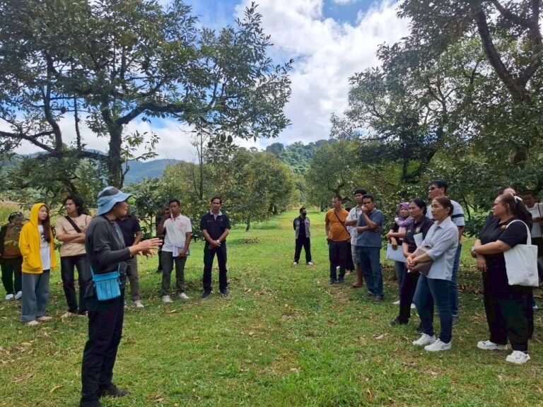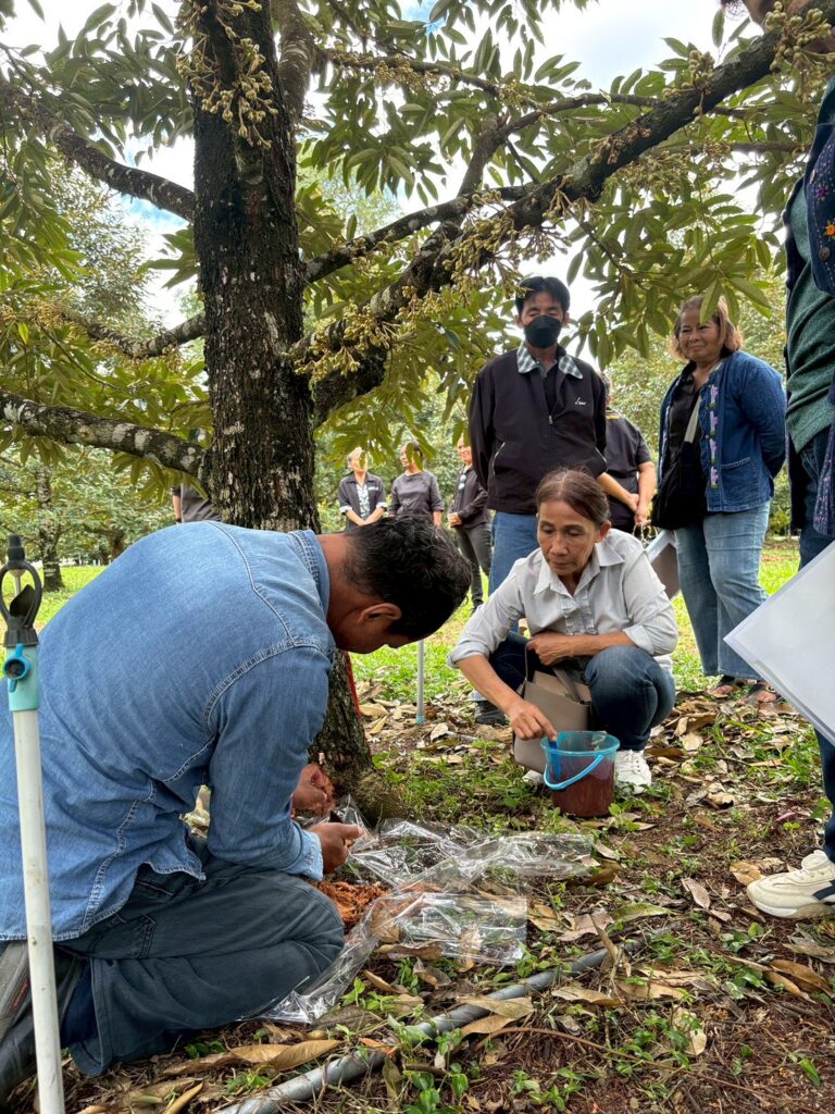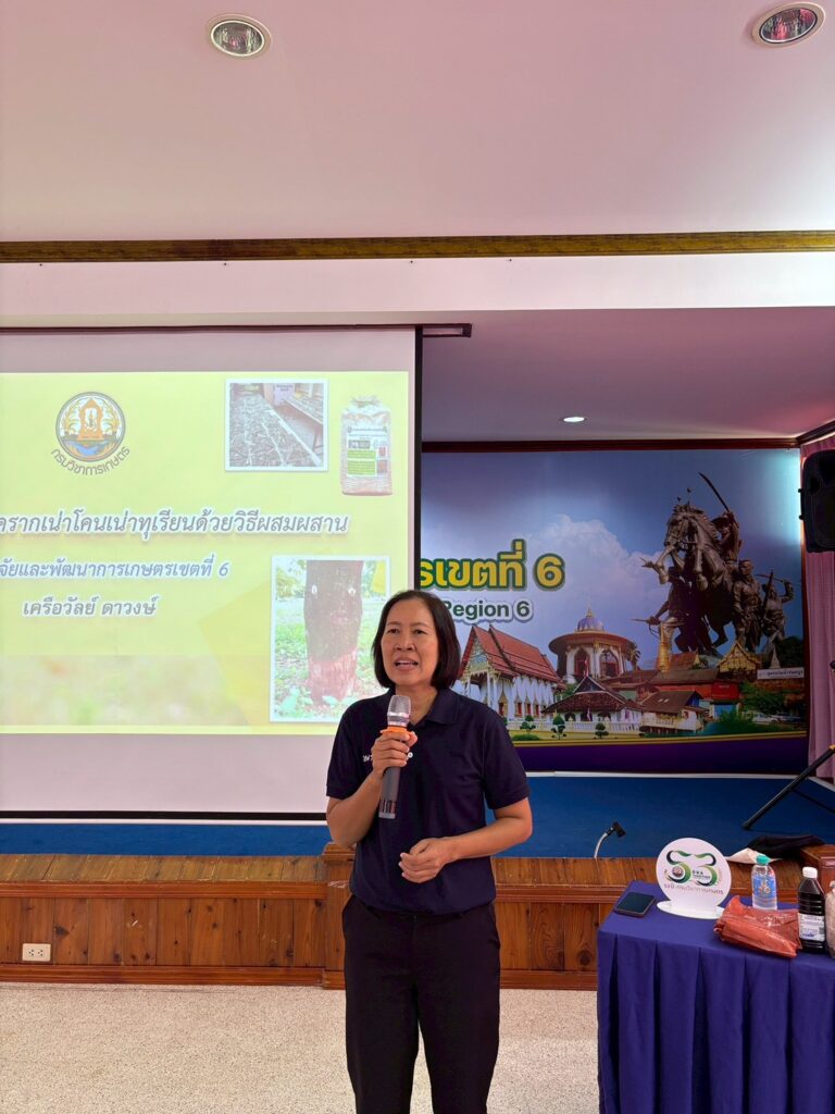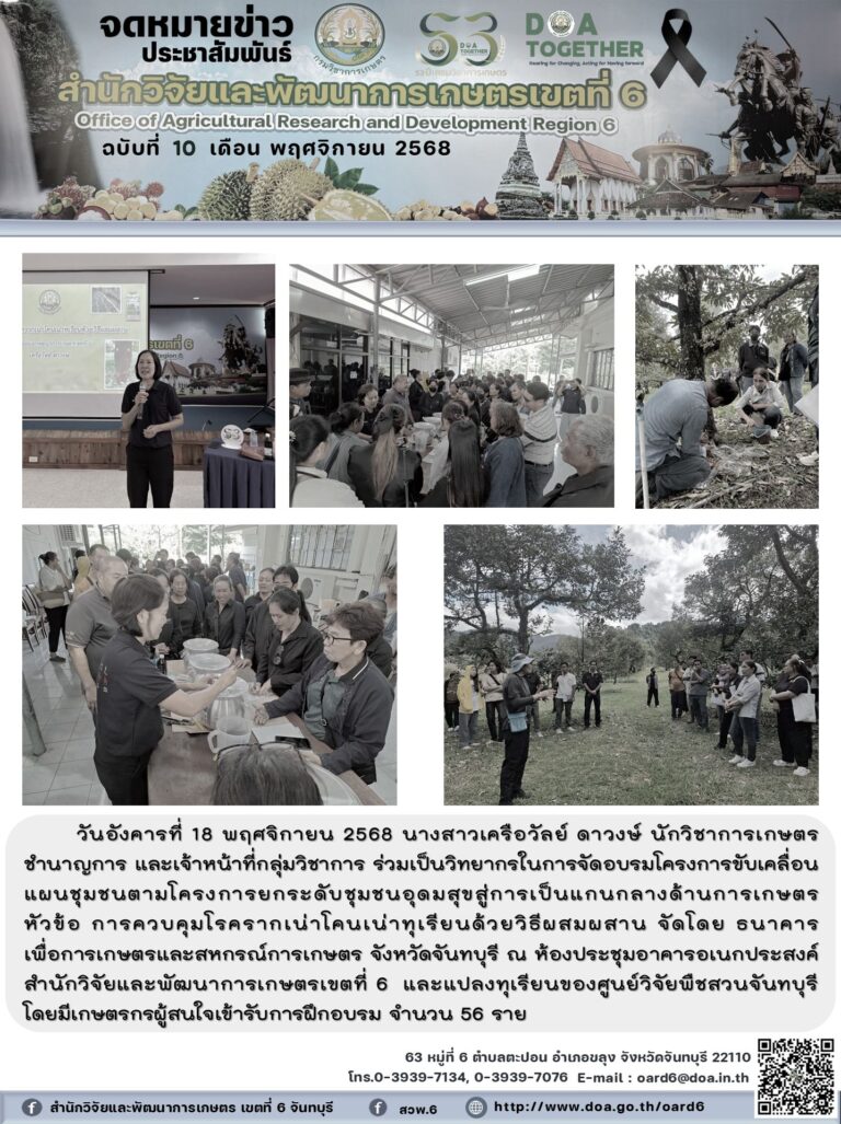 สวพ.6 ร่วมเป็นวิทยากรในการจัดอบรมโครงการขับเคลื่อน แผนชุมชนตามโครงการยกระดับชุมชนอุดมสุขสู่การเป็นแกนกลางด้านการเกษตร หัวข้อ การควบคุมโรครากเน่าโคนเน่าทุเรียนด้วยวิธีผสมผสาน 18 พฤศจิกายน 2025 admin กิจกรรม สวพ.6, ข่าว วันอังคารที่ 18 พฤศจิกายน 2568 นางสาวเครือวัลย์ ดาวงษ์ นักวิชาการเกษตรชำนาญการ และเจ้าหน้าที่กลุ่มวิชาการ ร่วมเป็นวิทยากรในการจัดอบรมโครงการขับเคลื่อนแผนชุมชนตามโครงการยกระดับชุมชนอุดมสุขสู่การเป็นแกนกลางด้านการเกษตร หัวข้อ การควบคุมโรครากเน่าโคนเน่าทุเรียนด้วยวิธีผสมผสาน จัดโดย ธนาคารเพื่อการเกษตรและสหกรณ์การเกษตร จังหวัดจันทบุรี ณ ห้องประชุมอาคารอเนกประสงค์สำนักวิจัยและพัฒนาการเกษตรเขตที่ 6 และแปลงทุเรียนของศูนย์วิจัยพืชสวนจันทบุรี โดยมีเกษตรกรผู้สนใจเข้ารับการฝึกอบรม จำนวน 56 ราย FacebookFacebookXXLINELine