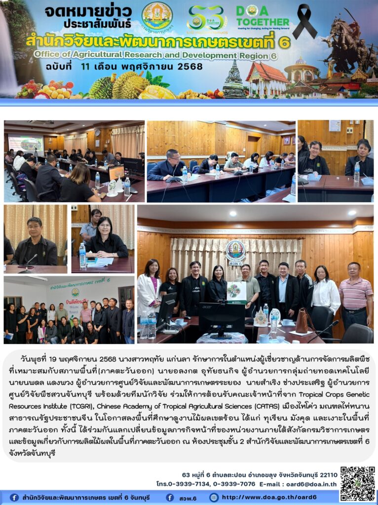 วันพุธที่ 19 พฤศจิกายน 2568 นางสาวหฤทัย แก่นลา รักษาการใบตำแหน่งผู้เชียวชาญล้านการจัดการผลิตพืชที่เหมาะสมกับสภาพพื้นที่(ภาคตะวันออก) นายอลงกต อุทัยธนกิจ ผู้อำนวยการกลุ่มถ่ายทอดเทคโนโลยี นายนพดล แดงพวง ผู้อำนวยการศูนย์วิจัยและพัฒนาการเกษตรระยอง นายสำเริง ช่างประเสริฐ ผู้อำนวยการศูนย์วิจัยพืชสวนจันทบุรี พร้อมด้วยทีมนักวิจัย ร่วมให้การต้อนรับคณะเจ้าหน้าที่จาก Tropical Crps Genebic Resources Instute /TOGRI, Chinese Academy of Tropical Agritural Sciences (CATAS) เมืองไค่ว มณฑลไห่หนาน สาธารณรัฐประชาชนจีน ในโอกาสลงพื้นที่ศึกษาดูงานไม้ผลเขตร้อน ได้แก่ ทุเรียน มังคด และเงาะในพื้นที่ภาคตะวันออก ทั้งนี้ ได้ร่วมกันแลกเปลี่ยนข้อมูลการกิจหน้าที่ของหน่วยงานภายใต้สังกัดกรมวิชาการเกษตร และข้อมูลเกี่ยวกับการผลิตไม้ผลในพื้นที่ภาคตะวันออก ณ ห้องประชุมชั้น 2 สำนักวิจัยและพัฒนาการเกษตระขตที่ 6 จังหวัดจันทบุรี