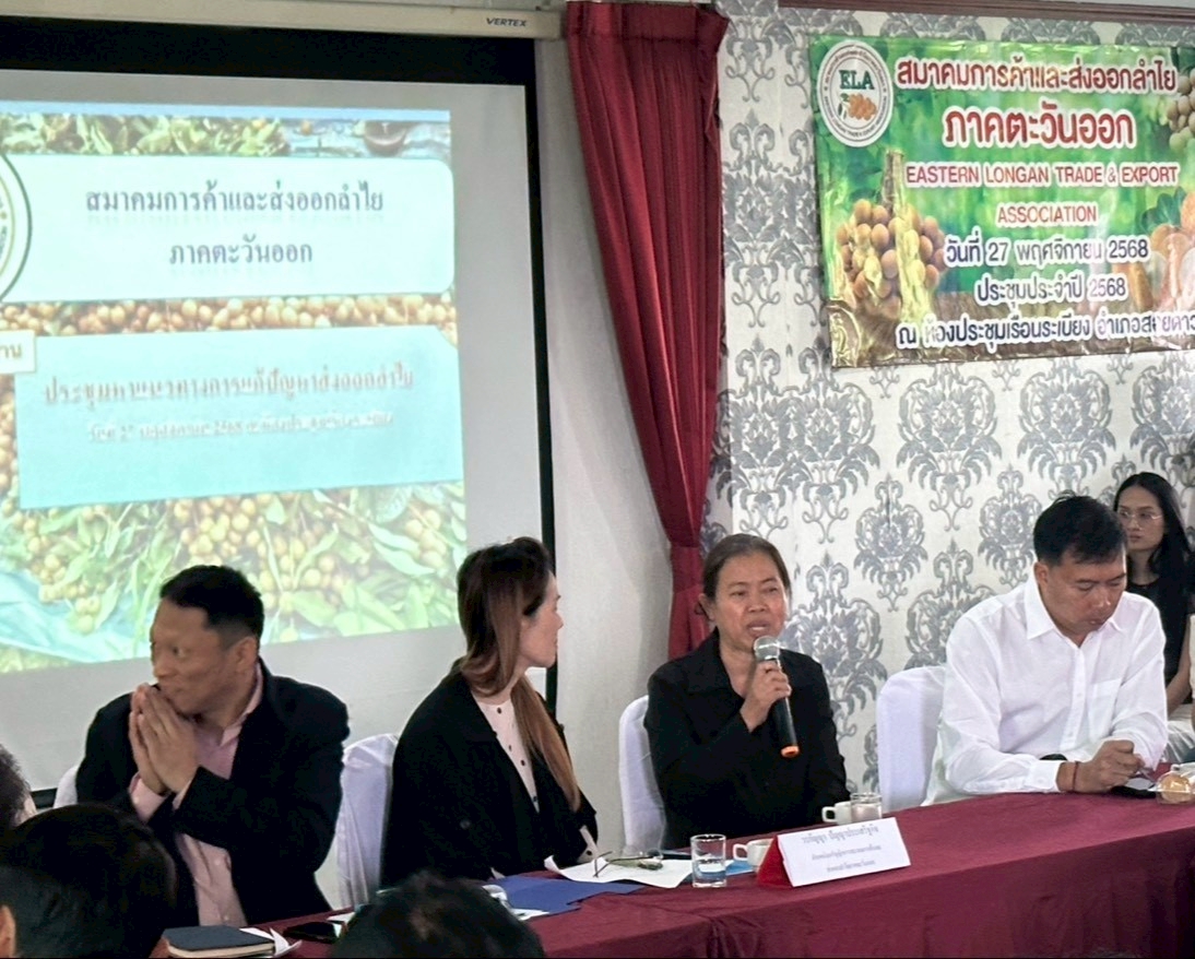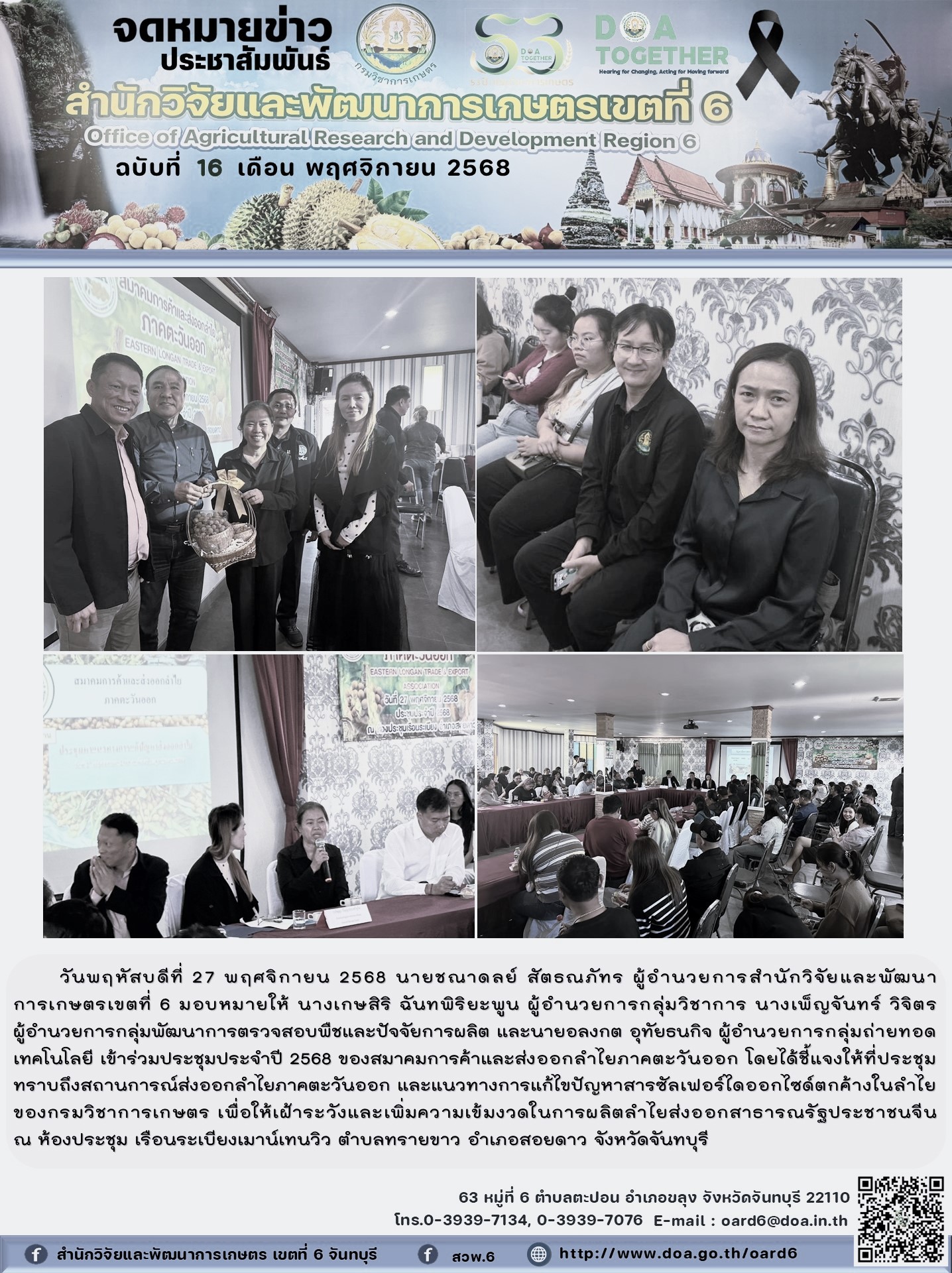 วันพฤหัสบดีที่ 27 พฤศจิกายน 2568 นายชณาดลย์ สัตธณภัทร ผู้อำนวยการสำนักวิจัยและพัฒนาการเกษตรเขตที่ 6 มอบหมายให้ นางเกษสิริ ฉันทพิริยะพูน ผู้อำนวยการกลุ่มวิชาการ นางเพ็ญจันทร์ วิจิตร ผู้อำนวยการกลุ่มพัฒนาการตรวจสอบพืชและปัจจัยการผลิต และนายอลงกต อุทัยธนกิจ ผู้อำนวยการกลุ่มถ่ายทอดเทคโนโลยี เข้าร่วมประชุมประจำปี 2568 ของสมาคมการค้าและส่งออกลำไยภาคตะวันออกโดยได้ชี้แจงให้ที่ประชุมทราบถึงสถานการณ์ส่งออกลำไยภาคตะวันออก และแนวทางการแก้ไขปัญหาสารซัลเฟอร์ไดออกไซด์ตกค้างในลำไยของกรมวิชาการเกษตร เพื่อให้เฝ้าระวังแตะเพิ่มความเข้มงวดในการผลิตลำไยส่งออกสาธารณรัฐประชาชนจีน ณ ห้องประชุม เรือนระเบียงเมาน์เทนวิว ตำบลทรายขาว อำเภอสอยดาว จังหวัดจันทบุรี