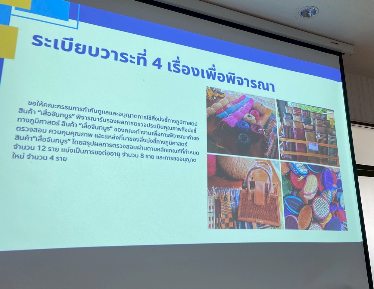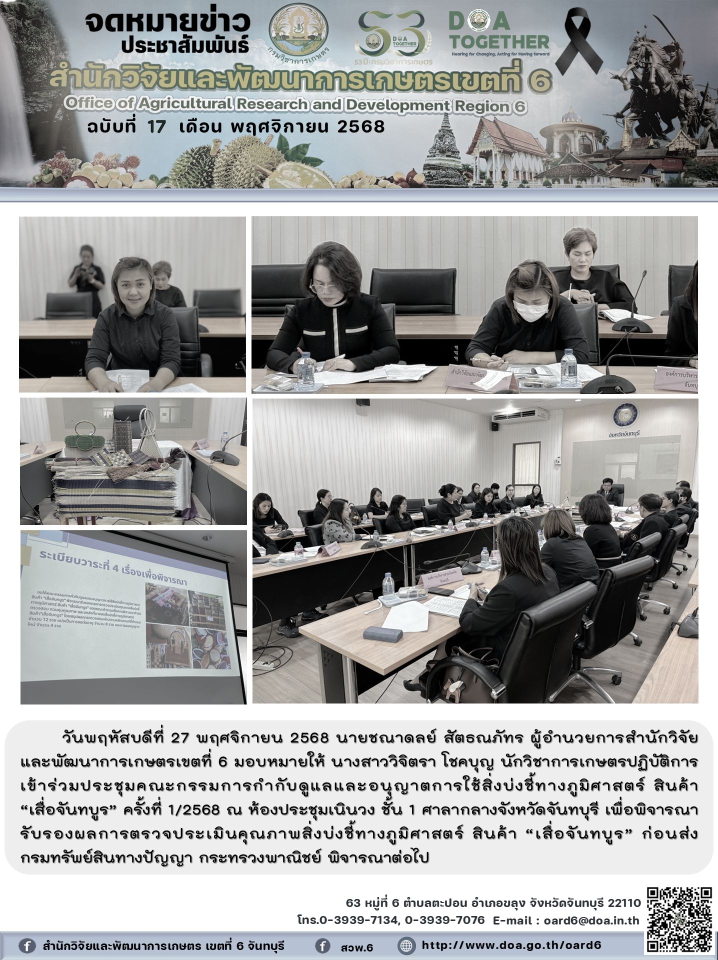 นางสาววิจิตรา โชคบุญ นักวิชาการเกษตรปฏิบัติการ สวพ.6 เข้าร่วมประชุมคณะกรรมการกำกับดูแลและอนุญาตการใช้สิ่งบ่งชี้ทางภูมิศาสตร์ สินค้า“เสื่อจันทบูร” ครั้งที่ 1/2568 11 ธันวาคม 2025 admin ไม่มีหมวดหมู่ วันพฤหัสบดีที่ 27 พฤศจิกายน 2568 นายชณาดลย์ สัตธณภัทร ผู้อำนวยการสำนักวิจัยและพัฒนาการเกษตรเขตที่ 6 มอบหมายให้ นางสาววิจิตรา โชคบุญ นักวิชาการเกษตรปฏิบัติการ เข้าร่วมประชุมคณะกรรมการกำกับดูแลและอนุญาตการใช้สิ่งบ่งชี้ทางภูมิศาสตร์ สินค้า “เสื่อจันทบูร” ครั้งที่ 1/2568 ณ ห้องประชุมเนินวง ชั้น 1 ศาลากลางจังหวัดจันทบุรี เพื่อพิจารณารับรองผลการตรวจประเมินคุณภาพสิ่งบ่งชี้ทางภูมิศาสตร์ สินค้า “เสื่อจันทบูร” ก่อนส่งกรมทรัพย์สินทางปัญญา กระทรวงพาณิชย์ พิจารณาต่อไป FacebookFacebookXXLINELine