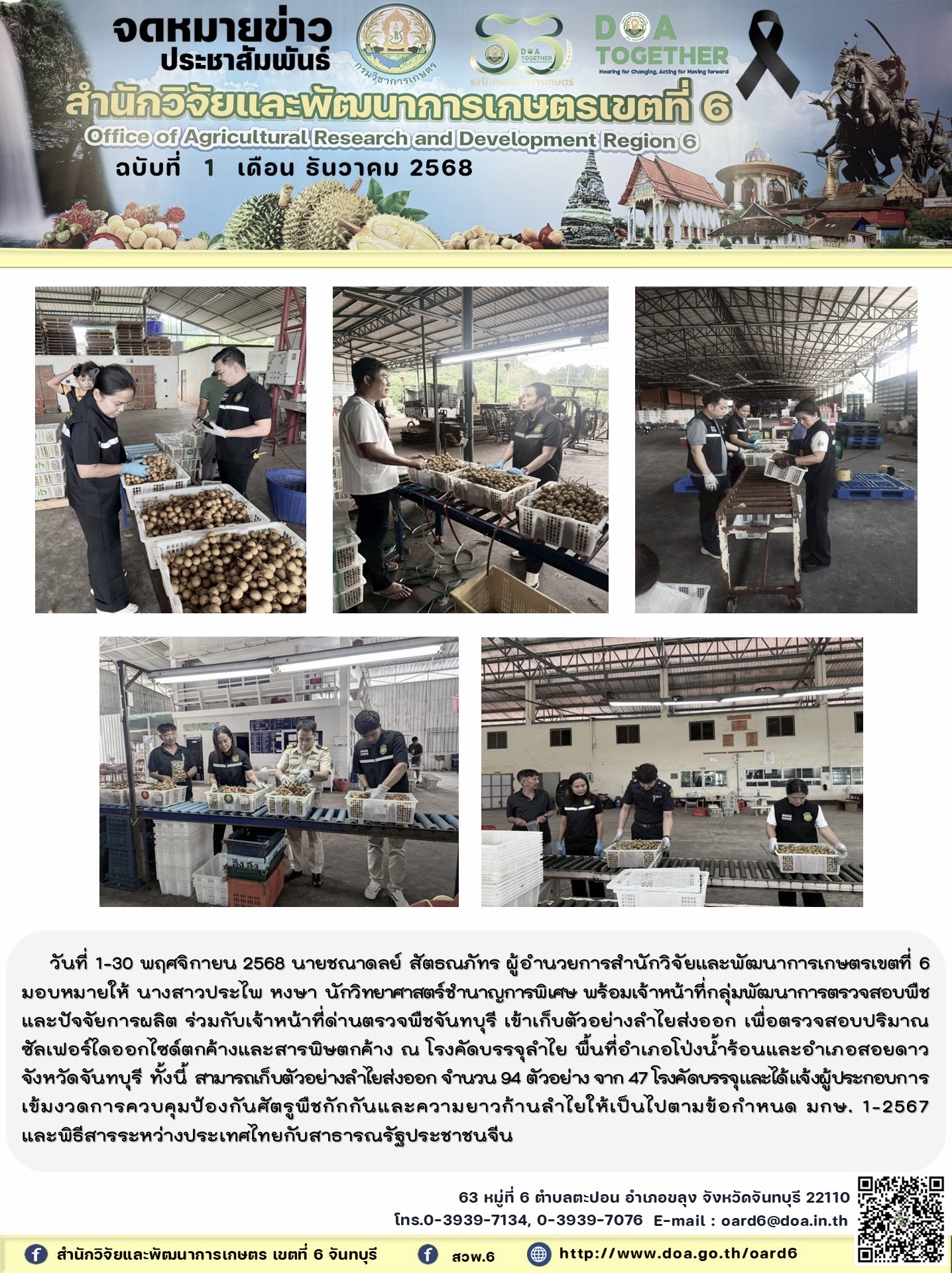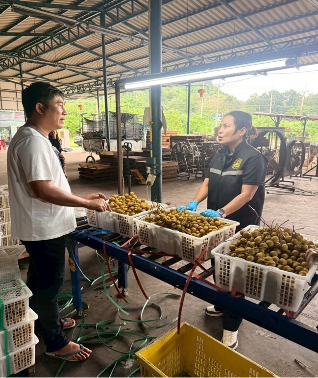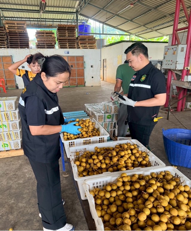 วันที่ 1-30 พฤศจิกายน 2568 นายชณาดลย์ สัตธณภัทร ผู้อำนวยการสำนักวิจัยและพัฒนาการเกษตรเขตที่ 6 มอบหมายให้ นางสาวประไพ หงษา นักวิทยาศาสตร์ชำนาญการพิเศษ พร้อมเจ้าหน้าที่กลุ่มพัฒนาการตรวจสอบพืชและปัจจัยการผลิต ร่วมกับเจ้าหน้าที่ด่านตรวจพืชจันทบุรี เข้าเก็บตัวอย่างลำไยส่งออก เพื่อตรวจสอบปริมาณซัลเฟอร์ไดออกไซด์ตกค้างและสารพิษตกค้าง ณ โรงคัดบรรจุลำไย พื้นที่อำเภอโป่งน้ำร้อนและอำเภอสอยดาว จังหวัดจันทบุรี ทั้งนี้ สามารถเก็บตัวอย่างลำไยส่งออก จำนวน 94 ตัวอย่าง จาก 47 โรงคัดบรรจุและได้แจ้งผู้ประกอบการเข้มงวดการควบคุมป้องกันศัตรูพืชกักกันและความยาวก้านลำไยให้เป็นไปตามข้อกำหนด มกษ. 1-2567 และพิธีสารระหว่างประเทศไทยกับสาธารณรัฐประชาชนจีน