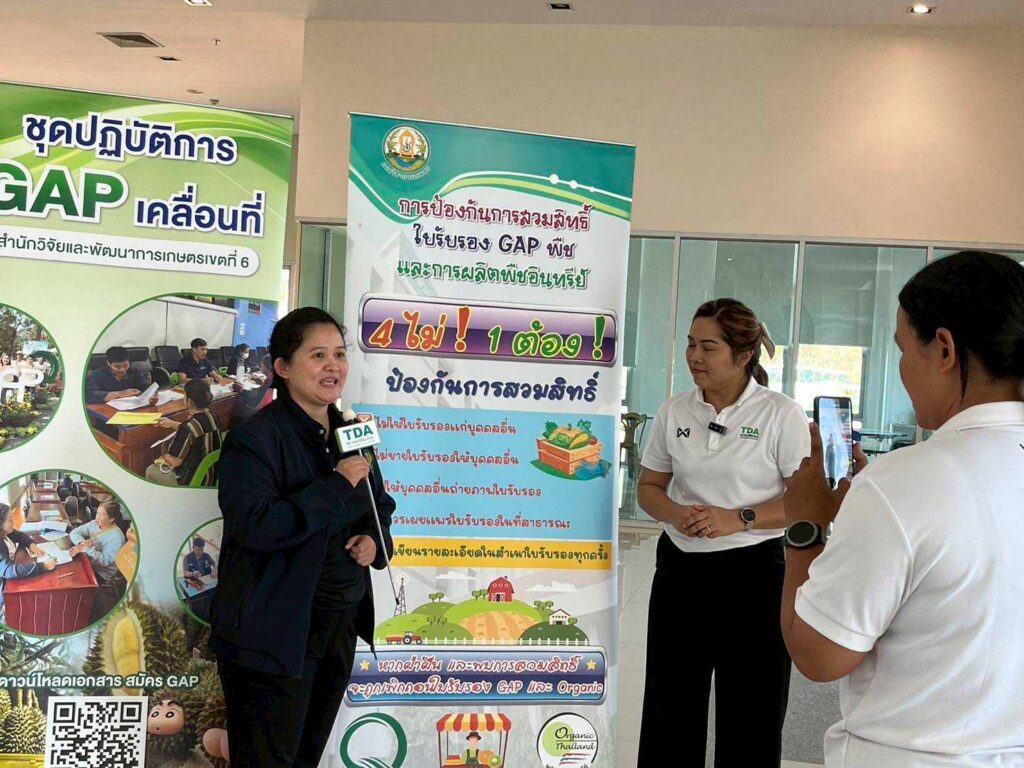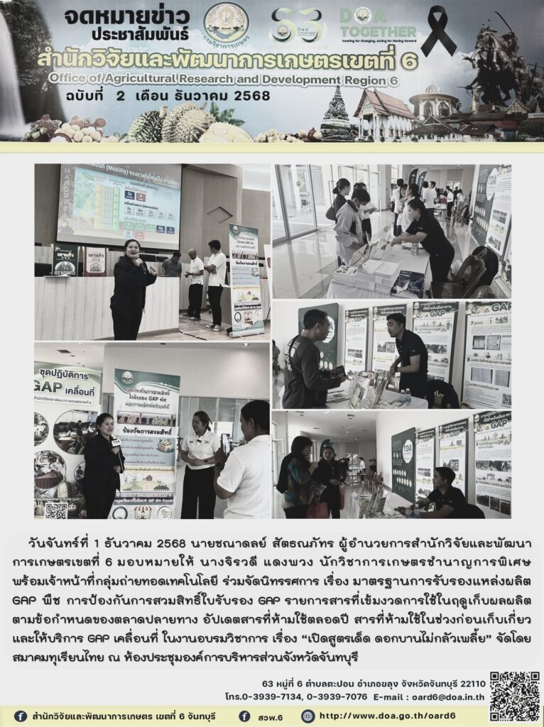 สวพ.6 ร่วมจัดนิทรรศการ เรื่อง มาตรฐานการรับรองแหล่งผลิต GAP พืช การป้องกันการสวมสิทธิ์ใบรับรอง GAP รายการสารที่เข้มงวดการใช้ในฤดูเก็บผลผลิต ตามข้อกำหนดของตลาดปลายทาง อัปเดตสารที่ห้ามใช้ตลอดปี 1 ธันวาคม 2025 admin กิจกรรม สวพ.6, ข่าว วันจันทร์ที่ 1 ธันวาคม 2568 นายชณาดลย์ สัตธณภัทร ผู้อำนวยการสำนักวิจัยและพัฒนาการเกษตรเขตที่ 6 มอบหมายให้ นางจิรวดี แดงพวง นักวิชาการเกษตรชำนาญการพิเศษ พร้อมเจ้าหน้าที่กลุ่มถ่ายทอดเทคโนโลยี ร่วมจัดนิทรรศการ เรื่อง มาตรฐานการรับรองแหล่งผลิต GAP พืช การป้องกันการสวมสิทธิ์ใบรับรอง GAP รายการสารที่เข้มงวดการใช้ในฤดูเก็บผลผลิต ตามข้อกำหนดของตลาดปลายทาง อัปเดตสารที่ห้ามใช้ตลอดปี สารที่ห้ามใช้ในช่วงก่อนเก็บเกี่ยวและให้บริการ GAP เคลื่อนที่ ในงานอบรมวิชาการ เรื่อง “เปิดสูตรเด็ด ดอกบานไม่กลัวเพลี้ย” จัดโดย สมาคมทุเรียนไทย ณ ห้องประชุมองค์การบริหารส่วนจังหวัดจันทบุรี FacebookFacebookXXLINELine