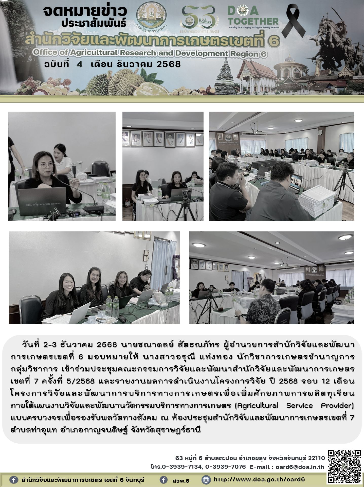 วันที่ 2-3 ธันวาคม 2568 นายชณาดลย์ สัตธณภัทร ผู้อำนวยการสำนักวิจัยและพัฒนา การเกษตรเขตที่ 6 มอบหมายให้ นางสาวอรุณี แท่งทอง นักวิชาการเกษตรชำนาญการ กลุ่มวิชาการ เข้าร่วมประชุมคณะกรรมการวิจัยและพัฒนาสำนักวิจัยและพัฒนาการเกษตรเขตที่ 7 ครั้งที่ 5/2568 และรายงานผลการดำเนินงานโครงการวิจัย ปี 2568 รอบ 12 เดือน โครงการวิจัยและพัฒนาการบริการทางการเกษตรเพื่อเพิ่มศักยภาพการผลิตทุเรียน ภายใต้แผนงานวิจัยและพัฒนานวัตกรรมบริการทางการเกษตร (Agricultural Service Provider) แบบครบวงจรเพื่อรองรับพลวัตทางสังคม ณ ห้องประชุมสำนักวิจัยและพัฒนาการเกษตรเขตที่ 7 ตำบลท่าอุแท อำเภอกาญจนดิษฐ์ จังหวัดสุราษฎร์ธานี