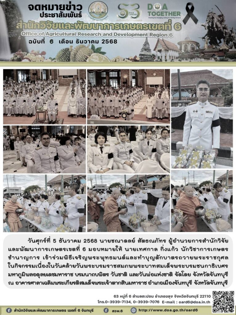 นายเทศกาล กิ่งแก้ว นักวิชาการเกษตรชำนาญการ เข้าร่วมพิธีเจริญพระพุทธมนต์และทำบุญตักบาตรถวายพระราชกุศลในกิจกรรมเนื่องในวันคล้ายวันพระบรมราชสมภพพระบาทสมเด็จพระบรมชนกาธิเบศร มหาภูมิพลอดุลยเดชมหาราช บรมนาถบพิตร วันชาติ และวันพ่อแห่งชาติ 5 ธันวาคม 2025 admin กิจกรรม สวพ.6, ข่าว วันศุกร์ที่ 5 ธันวาคม 2568 นายชณาดลย์ สัตธณภัทร ผู้อำนวยการสำนักวิจัย และพัฒนาการเกษตรเขตที่ 6 มอบหมายให้ นายเทศกาล กิ่งแก้ว นักวิชาการเกษตรชำนาญการ เข้าร่วมพิธีเจริญพระพุทธมนต์และทำบุญตักบาตรถวายพระราชกุศล ในกิจกรรมเนื่องในวันคล้ายวันพระบรมราชสมภพพระบาทสมเด็จพระบรมชนกาธิเบศร มหาภูมิพลอดุลยเดชมหาราช บรมนาถบพิตร วันชาติ และวันพ่อแห่งชาติ จัดโดย จังหวัดจันทบุรี ณ อาคารศาลาเฉลิมพระเกียรติสมเด็จพระเจ้าตากสินมหาราช อำเภอเมืองจันทบุรี จังหวัดจันทบุรี FacebookFacebookXXLINELine