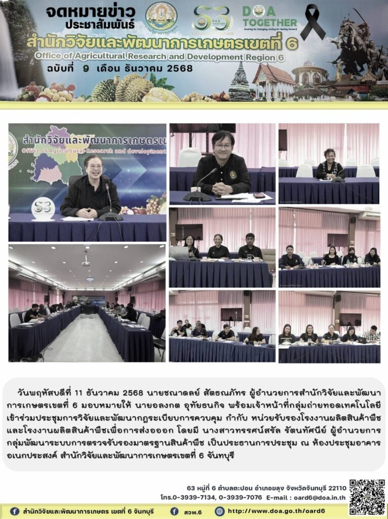 ผอ.สวพ.6 มอบหมายให้ นายอลงกต อุทัยธนกิจ พร้อมเจ้าหน้าที่กลุ่มถ่ายทอดเทคโนโลยี เข้าร่วมประชุมการวิจัยและพัฒนากฎระเบียบการควบคุม กำกับ หน่วยรับรองโรงงานผลิตสินค้าพืช และโรงงานผลิตสินค้าพืชเพื่อการส่งอออก 11 ธันวาคม 2025 admin กิจกรรม สวพ.6, ข่าว วันพฤหัสบดีที่ 11 ธันวาคม 2568 นายชณาดลย์ สัตธณภัทร ผู้อำนวยการสำนักวิจัยและพัฒนา การเกษตรเขตที่ 6 มอบหมายให้ นายอลงกต อุทัยธนกิจ พร้อมเจ้าหน้าที่กลุ่มถ่ายทอดเทคโนโลยี เข้าร่วมประชุมการวิจัยและพัฒนากฎระเบียบการควบคุม กำกับ หน่วยรับรองโรงงานผลิตสินค้าพืช และโรงงานผลิตสินค้าพืชเพื่อการส่งอออก โดยมี นางสาวทรรศน์สรัล รัตนทัศนีย์ ผู้อำนวยการกลุ่มพัฒนาระบบการตรวจรับรองมาตรฐานสินค้าพืช เป็นประธานการประชุม ณ ห้องประชุมอาคารอเนกประสงค์ สำนักวิจัยและพัฒนาการเกษตรเขตที่ 6 จันทบุรี FacebookFacebookXXLINELine