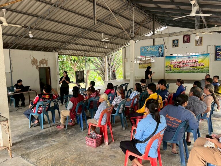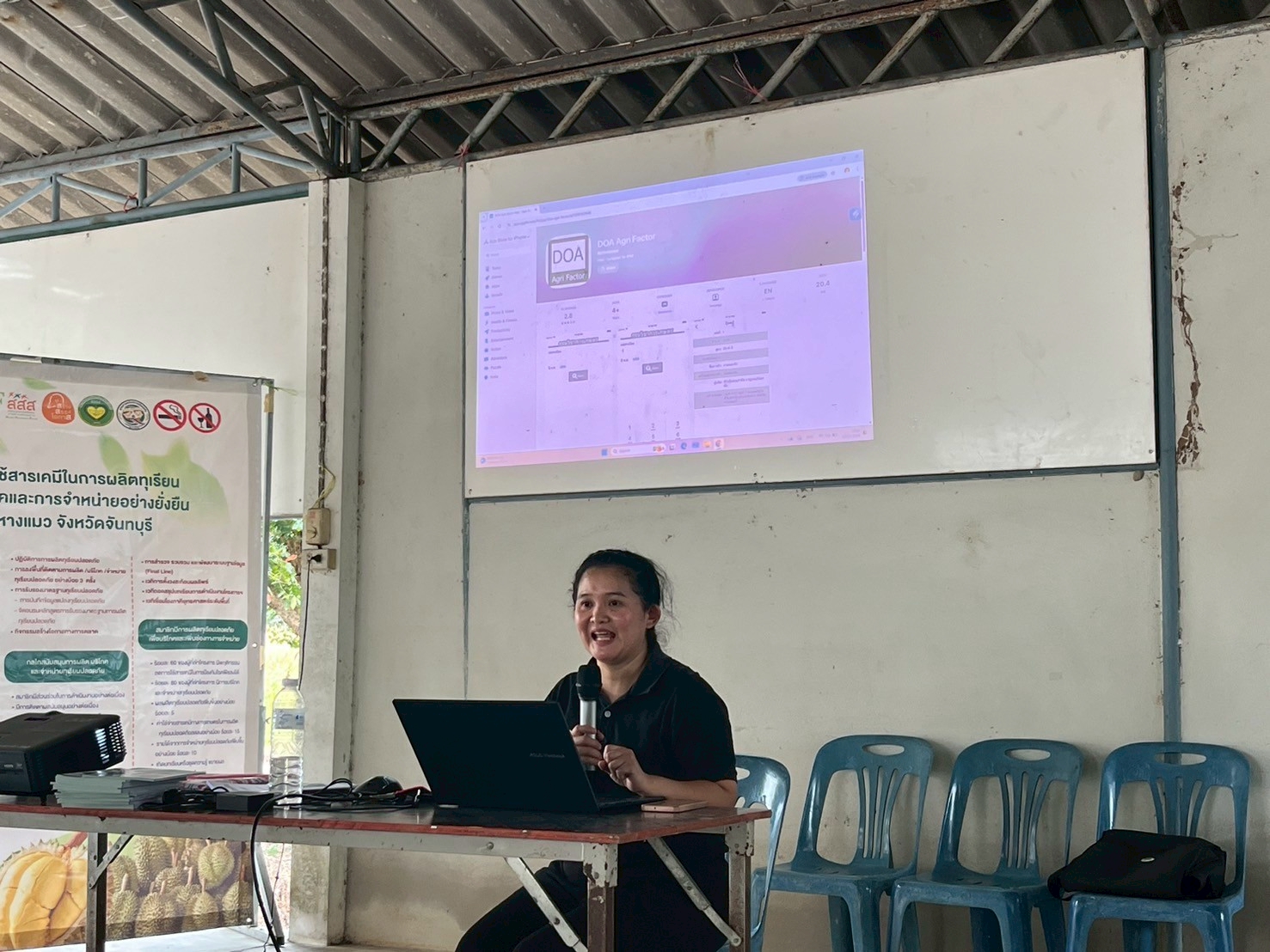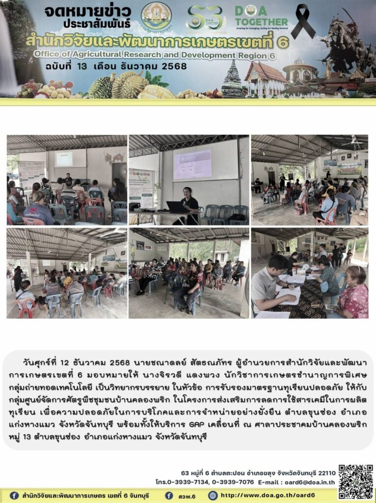 กลุ่มถ่ายทอดเทคโนโลยีสวพ.6 เป็นวิทยากรบรรยาย ในหัวข้อ การรับรองมาตรฐานทุเรียนปลอดภัย ให้กับกลุ่มศูนย์จัดการศัตรูพืชชุมชนบ้านคลองพริก 12 ธันวาคม 2025 admin กิจกรรม สวพ.6, ข่าว วันศุกร์ที่ 12 ธันวาคม 2568 นายชณาดลย์ สัตธณภัทร ผู้อำนวยการสำนักวิจัยและพัฒนาการเกษตรเขตที่ 6 มอบหมายให้ นางจิรวดี แดงพวง นักวิชาการเกษตรชำนาญการพิเศษ กลุ่มถ่ายทอดเทคโนโลยี เป็นวิทยากรบรรยาย ในหัวข้อ การรับรองมาตรฐานทุเรียนปลอดภัย ให้กับกลุ่มศูนย์จัดการศัตรูพืชชุมชนบ้านคลองพริก ในโครงการส่งเสริมการลดการใช้สารเคมีในการผลิตทุเรียน เพื่อความปลอดภัยในการบริโภคและการจำหน่ายอย่างยั่งยืน ตำบลขุนซ่อง อำเภอแก่งหางแมว จังหวัดจันทบุรี พร้อมทั้งให้บริการ GAP เคลื่อนที่ ณ ศาลาประชาคมบ้านคลองพริก หมู่ 13 ตำบลขุนซ่อง อำเภอแก่งหางแมว จังหวัดจันทบุรี FacebookFacebookXXLINELine